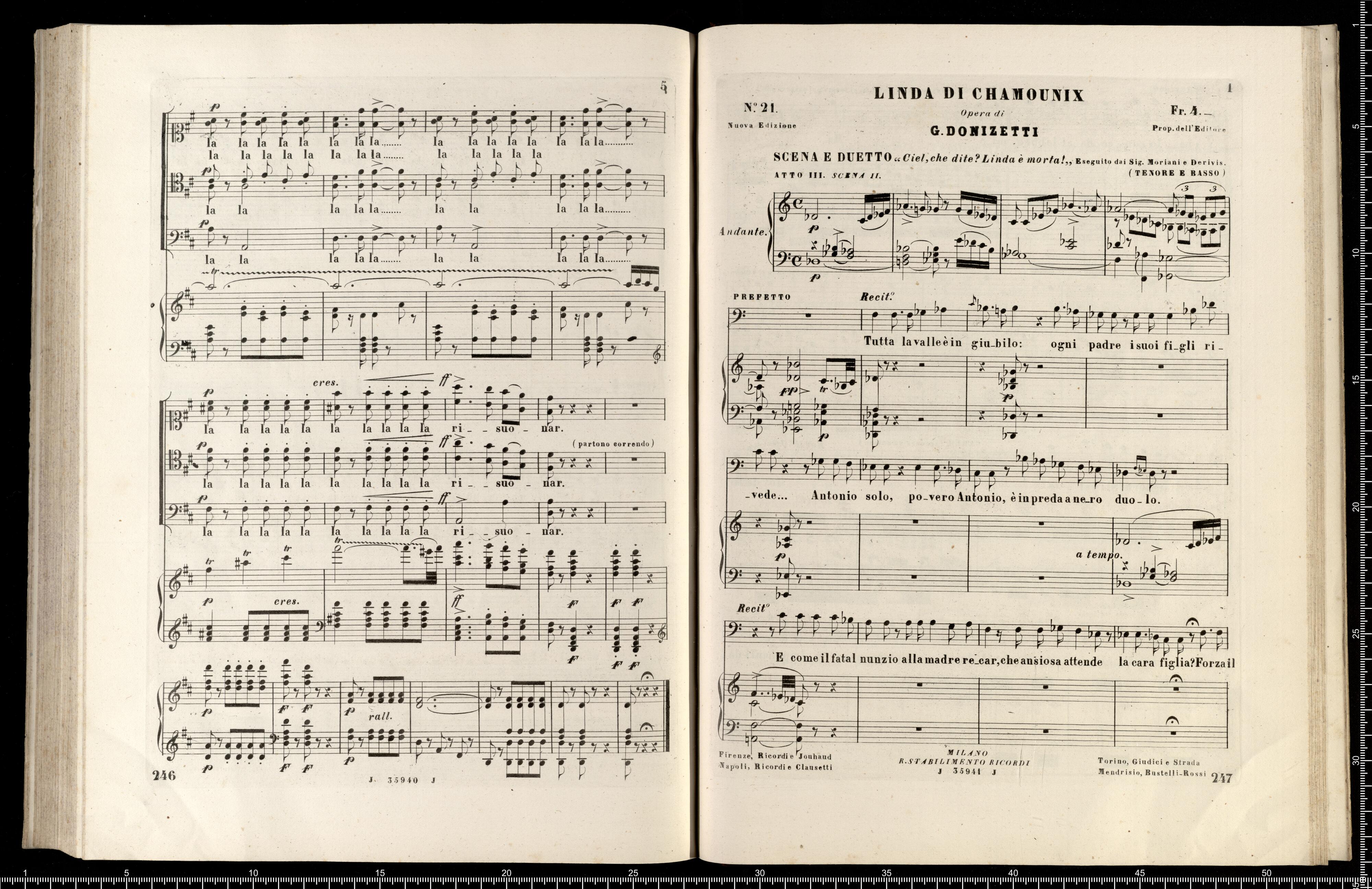 [cover - without title] [title page:] LINDA DI CHAMOUNIX | MELODRAMMA IN TRE ATTI DI G. ROSSI | posto in musica ed umilimente dedicato a S. M. | MARIA ANNA CAROLINA | Imperatrice d'Austria, Regina di Boemia, ecc., ecc. | DA | GAETANO DONIZETTI | Maestro di Cappella di Camera e Compisitore di Corte di S. M. l'Omperatore d'Austria. | RAPPRENENTATO PER LA PRIMA VOLTA AL TEATRO DI PORTA CARINZIA IN VIENNA | LA PRIMAVERA 1842 | RIDUZIONE PER CANTO E PIANOFORTE | NUOVA EDIZIONE RIVEDUTA | coi pezzi aggiunti dall'Autore a Parigi | Proprietà dell'Editore Fr. 36 - | R. Stabilimento Musicale Ricordi | MILANO | NAPOLI - ROMA - FIRENZE