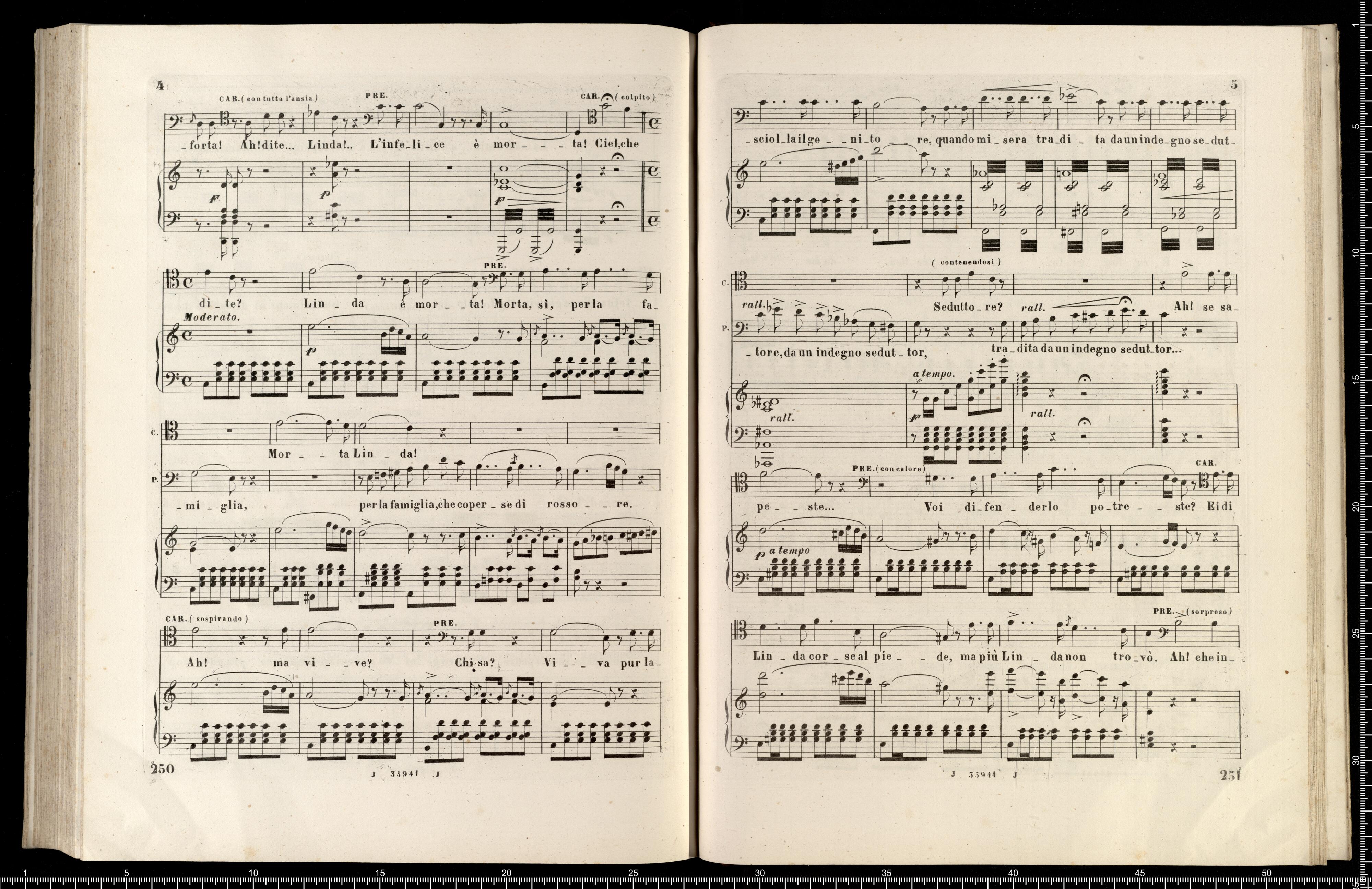 [cover - without title] [title page:] LINDA DI CHAMOUNIX | MELODRAMMA IN TRE ATTI DI G. ROSSI | posto in musica ed umilimente dedicato a S. M. | MARIA ANNA CAROLINA | Imperatrice d'Austria, Regina di Boemia, ecc., ecc. | DA | GAETANO DONIZETTI | Maestro di Cappella di Camera e Compisitore di Corte di S. M. l'Omperatore d'Austria. | RAPPRENENTATO PER LA PRIMA VOLTA AL TEATRO DI PORTA CARINZIA IN VIENNA | LA PRIMAVERA 1842 | RIDUZIONE PER CANTO E PIANOFORTE | NUOVA EDIZIONE RIVEDUTA | coi pezzi aggiunti dall'Autore a Parigi | Proprietà dell'Editore Fr. 36 - | R. Stabilimento Musicale Ricordi | MILANO | NAPOLI - ROMA - FIRENZE