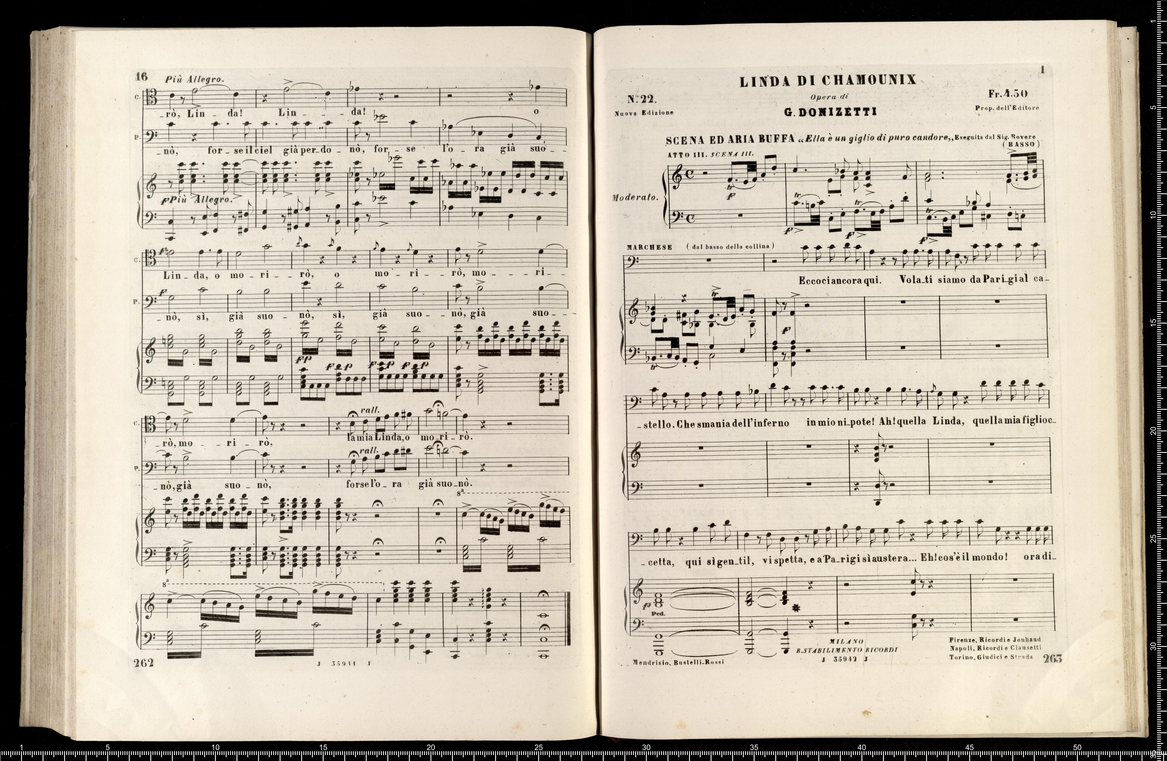 [cover - without title] [title page:] LINDA DI CHAMOUNIX | MELODRAMMA IN TRE ATTI DI G. ROSSI | posto in musica ed umilimente dedicato a S. M. | MARIA ANNA CAROLINA | Imperatrice d'Austria, Regina di Boemia, ecc., ecc. | DA | GAETANO DONIZETTI | Maestro di Cappella di Camera e Compisitore di Corte di S. M. l'Omperatore d'Austria. | RAPPRENENTATO PER LA PRIMA VOLTA AL TEATRO DI PORTA CARINZIA IN VIENNA | LA PRIMAVERA 1842 | RIDUZIONE PER CANTO E PIANOFORTE | NUOVA EDIZIONE RIVEDUTA | coi pezzi aggiunti dall'Autore a Parigi | Proprietà dell'Editore Fr. 36 - | R. Stabilimento Musicale Ricordi | MILANO | NAPOLI - ROMA - FIRENZE