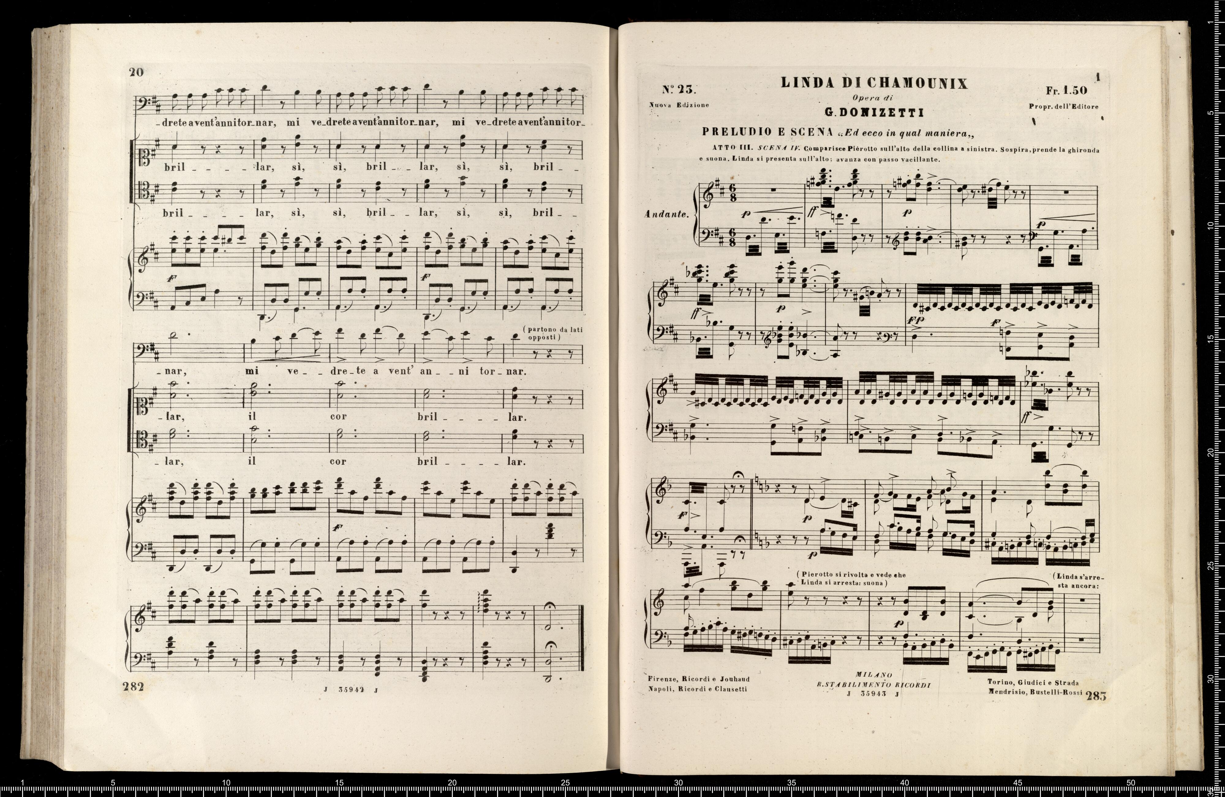 [cover - without title] [title page:] LINDA DI CHAMOUNIX | MELODRAMMA IN TRE ATTI DI G. ROSSI | posto in musica ed umilimente dedicato a S. M. | MARIA ANNA CAROLINA | Imperatrice d'Austria, Regina di Boemia, ecc., ecc. | DA | GAETANO DONIZETTI | Maestro di Cappella di Camera e Compisitore di Corte di S. M. l'Omperatore d'Austria. | RAPPRENENTATO PER LA PRIMA VOLTA AL TEATRO DI PORTA CARINZIA IN VIENNA | LA PRIMAVERA 1842 | RIDUZIONE PER CANTO E PIANOFORTE | NUOVA EDIZIONE RIVEDUTA | coi pezzi aggiunti dall'Autore a Parigi | Proprietà dell'Editore Fr. 36 - | R. Stabilimento Musicale Ricordi | MILANO | NAPOLI - ROMA - FIRENZE