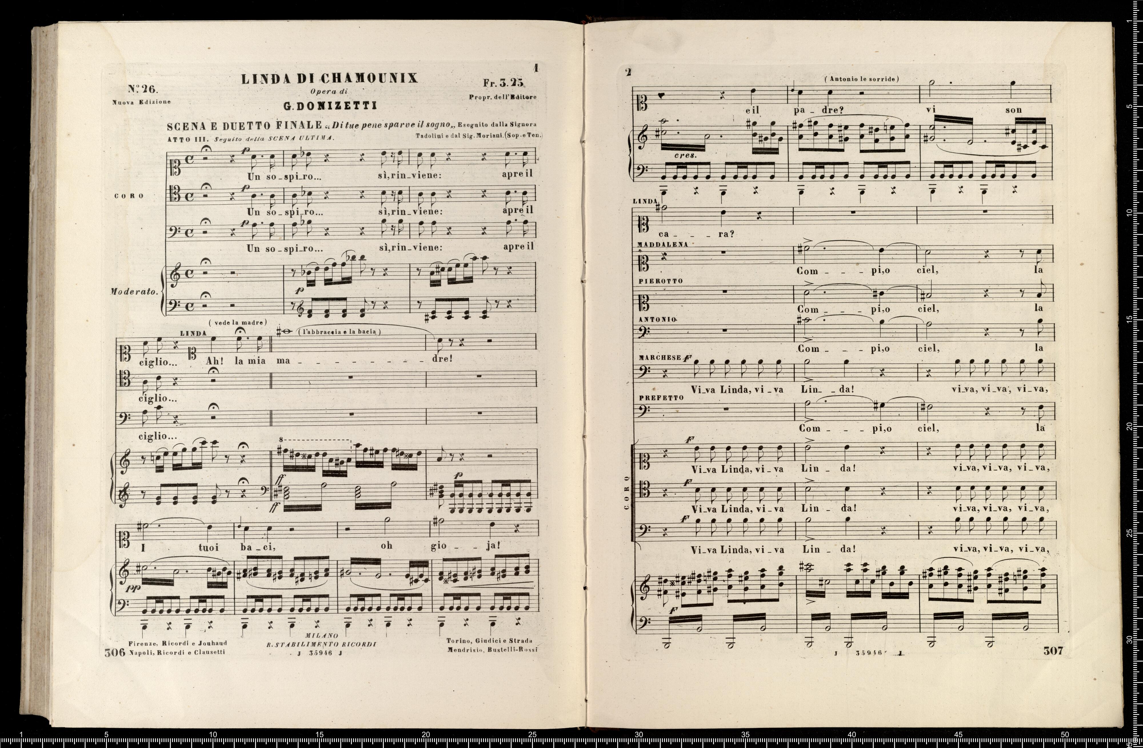 [cover - without title] [title page:] LINDA DI CHAMOUNIX | MELODRAMMA IN TRE ATTI DI G. ROSSI | posto in musica ed umilimente dedicato a S. M. | MARIA ANNA CAROLINA | Imperatrice d'Austria, Regina di Boemia, ecc., ecc. | DA | GAETANO DONIZETTI | Maestro di Cappella di Camera e Compisitore di Corte di S. M. l'Omperatore d'Austria. | RAPPRENENTATO PER LA PRIMA VOLTA AL TEATRO DI PORTA CARINZIA IN VIENNA | LA PRIMAVERA 1842 | RIDUZIONE PER CANTO E PIANOFORTE | NUOVA EDIZIONE RIVEDUTA | coi pezzi aggiunti dall'Autore a Parigi | Proprietà dell'Editore Fr. 36 - | R. Stabilimento Musicale Ricordi | MILANO | NAPOLI - ROMA - FIRENZE