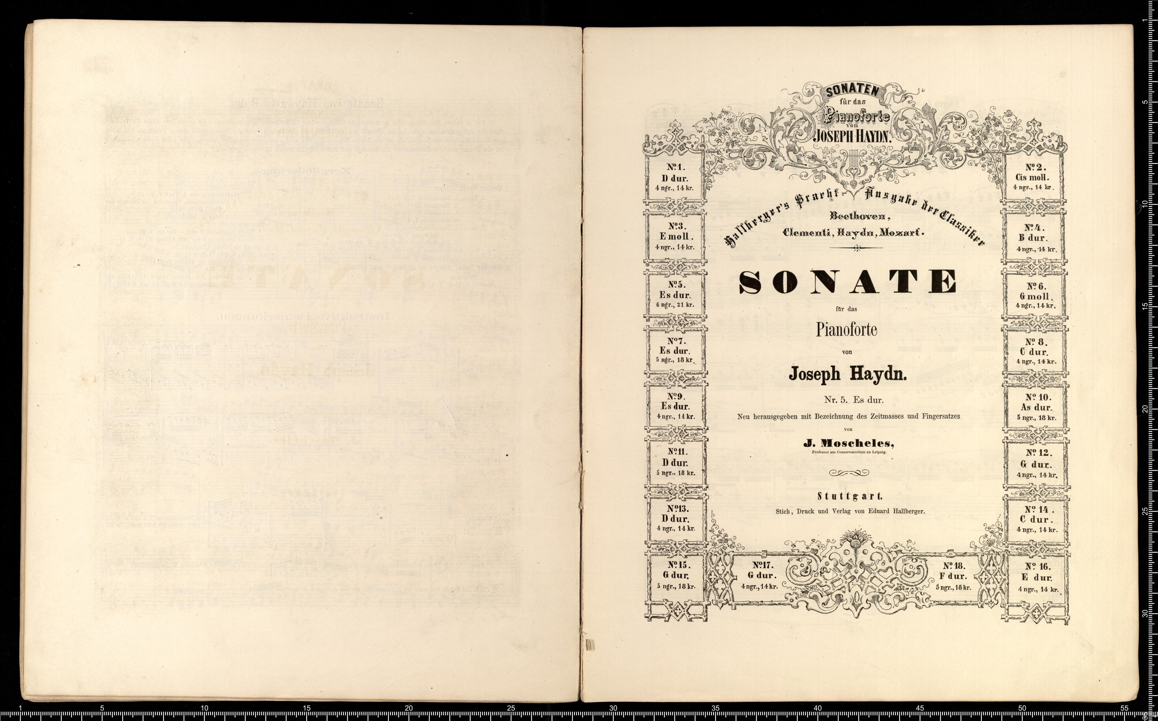 Hallberger's Pracht-Ausgabe | der Classiker | Beethoven, Clementi, Haydn, Mozart, Weber. | Ausgewählte Sonaten | für das | Pianoforte | von | Josepf Haydn. | Ausgegeben mit Bezeichnung des Zeitmaßes und Fingersatzes | von | I. Moscheles, | weil. Professor am Conservatorium für Musik in Leipzig. | Sibente Auflage. | Mit instructiven Erläterungen zu jedem einzelnen Werk. | Erster Band, | enthält: | Nro. 1. D rud. - Nro. 2. Cis moll. - Nro. 3. E moll. - Nro. 4 B dur. - Nro. 5. Es dur. - Nro. 6. G moll. | Nro. 7. Es dur. - Nro. 8. C dur. - Nro. 9. Es dur. | Stuttgart. | Stich, Druck und Verlag von Eduard Hallberger. | Jeder Band wird einzeln abgegeben