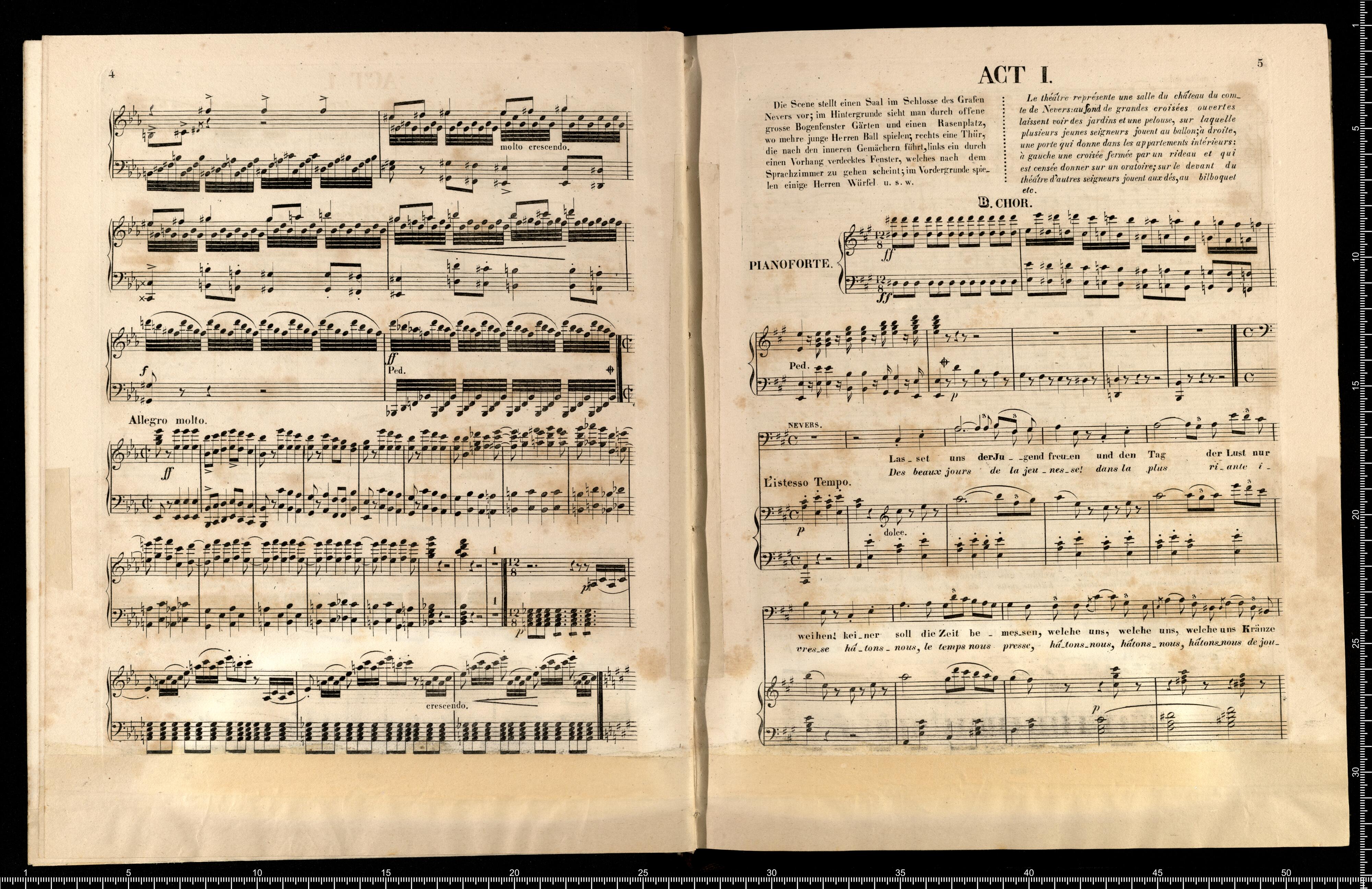 Die Hugenotten | (LES HUGUENOTS) | Grosse Oper in fünf Aufzügen | von E. Scribe | mit deutscher Übersetzung | von | J. F. CASTELLI | K. K. Landschafts Secretaire | componirt | von | Giacomo Meyerbeer | Kapellmeister am Königl. Preuss. Hofe | Ritter der Ehrenlegion etc. | Vollständiger Klavierauszug. | nach der Originalpartitur | von | CH. SCHWENCKE | MIT DEM PORTRAIT DES COMPONISTEN. | Eigenthum der Verleger. | Leipzig, bei Breitkopf & Härtel. | Paris, bei M. Schlesinger. London, bei Mori & Lavenn. | S|t Petersburg, bei Bernard & Holtz. Moskau, bei Paul Lehnhold. | Pr. 15 Thaler netto