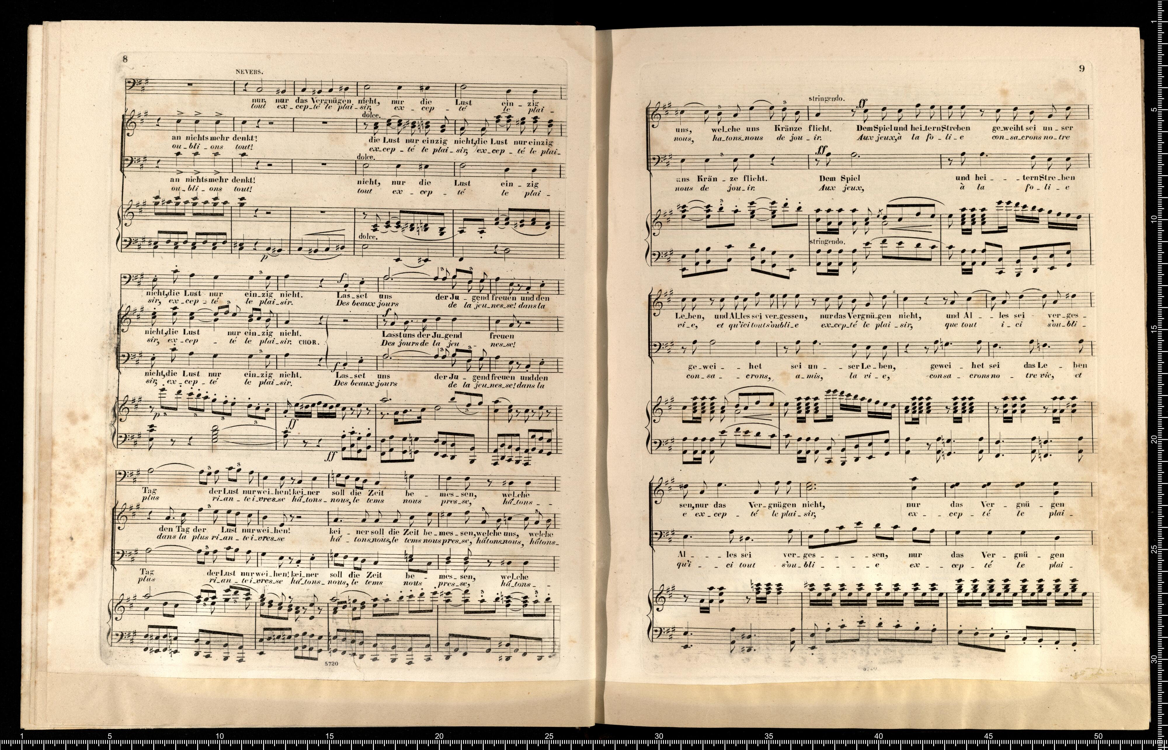 Die Hugenotten | (LES HUGUENOTS) | Grosse Oper in fünf Aufzügen | von E. Scribe | mit deutscher Übersetzung | von | J. F. CASTELLI | K. K. Landschafts Secretaire | componirt | von | Giacomo Meyerbeer | Kapellmeister am Königl. Preuss. Hofe | Ritter der Ehrenlegion etc. | Vollständiger Klavierauszug. | nach der Originalpartitur | von | CH. SCHWENCKE | MIT DEM PORTRAIT DES COMPONISTEN. | Eigenthum der Verleger. | Leipzig, bei Breitkopf & Härtel. | Paris, bei M. Schlesinger. London, bei Mori & Lavenn. | S|t Petersburg, bei Bernard & Holtz. Moskau, bei Paul Lehnhold. | Pr. 15 Thaler netto