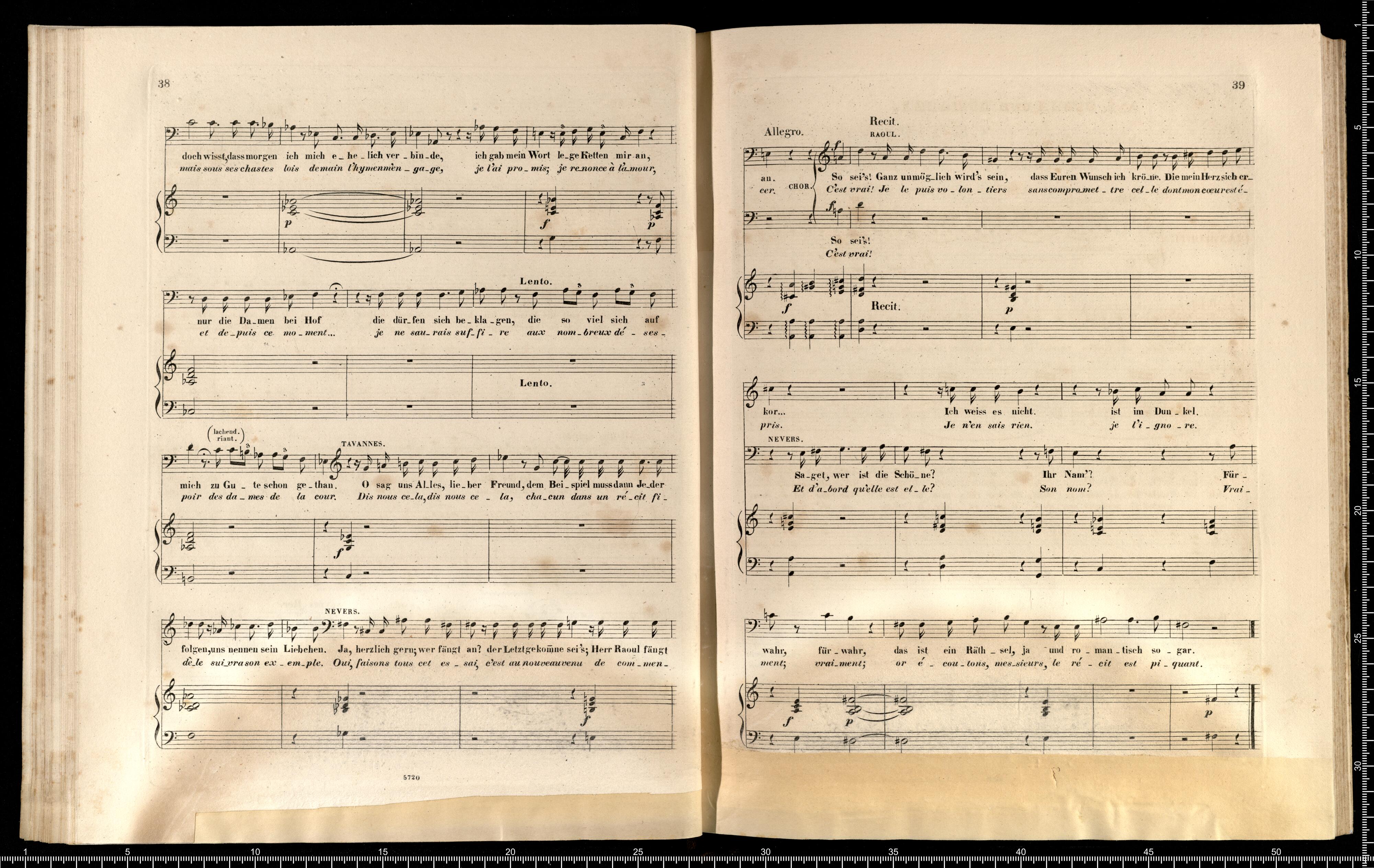 Die Hugenotten | (LES HUGUENOTS) | Grosse Oper in fünf Aufzügen | von E. Scribe | mit deutscher Übersetzung | von | J. F. CASTELLI | K. K. Landschafts Secretaire | componirt | von | Giacomo Meyerbeer | Kapellmeister am Königl. Preuss. Hofe | Ritter der Ehrenlegion etc. | Vollständiger Klavierauszug. | nach der Originalpartitur | von | CH. SCHWENCKE | MIT DEM PORTRAIT DES COMPONISTEN. | Eigenthum der Verleger. | Leipzig, bei Breitkopf & Härtel. | Paris, bei M. Schlesinger. London, bei Mori & Lavenn. | S|t Petersburg, bei Bernard & Holtz. Moskau, bei Paul Lehnhold. | Pr. 15 Thaler netto