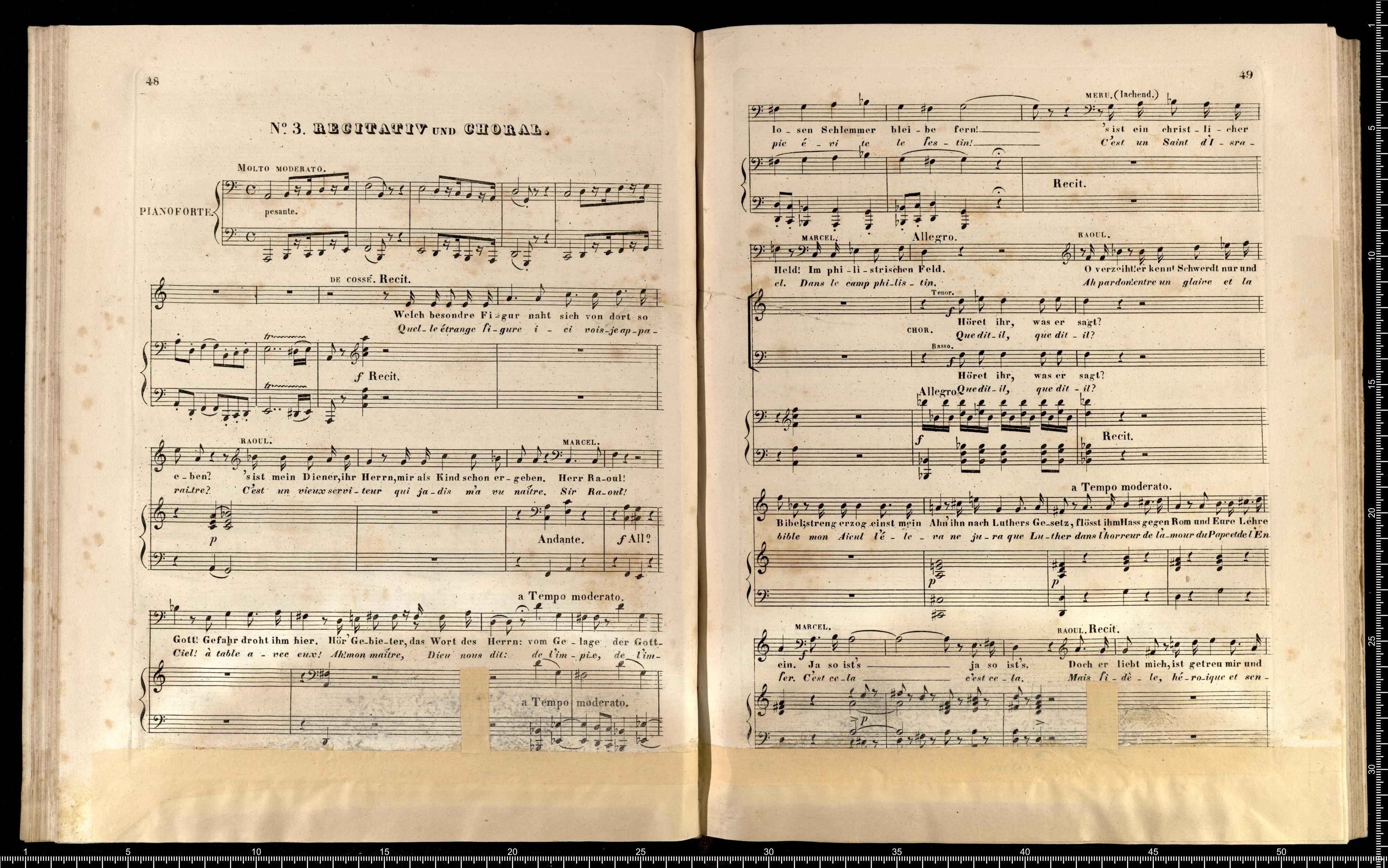 Die Hugenotten | (LES HUGUENOTS) | Grosse Oper in fünf Aufzügen | von E. Scribe | mit deutscher Übersetzung | von | J. F. CASTELLI | K. K. Landschafts Secretaire | componirt | von | Giacomo Meyerbeer | Kapellmeister am Königl. Preuss. Hofe | Ritter der Ehrenlegion etc. | Vollständiger Klavierauszug. | nach der Originalpartitur | von | CH. SCHWENCKE | MIT DEM PORTRAIT DES COMPONISTEN. | Eigenthum der Verleger. | Leipzig, bei Breitkopf & Härtel. | Paris, bei M. Schlesinger. London, bei Mori & Lavenn. | S|t Petersburg, bei Bernard & Holtz. Moskau, bei Paul Lehnhold. | Pr. 15 Thaler netto