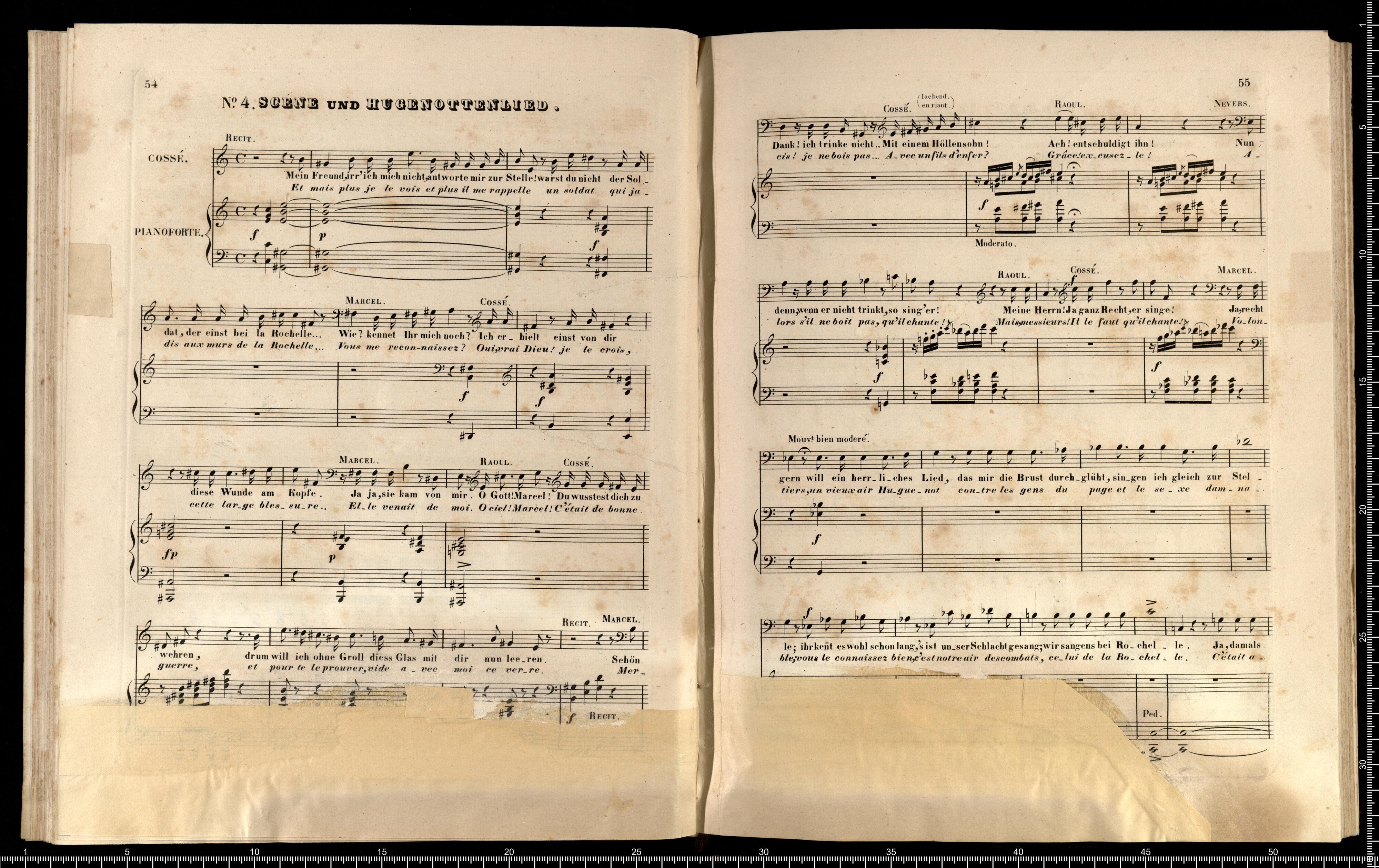 Die Hugenotten | (LES HUGUENOTS) | Grosse Oper in fünf Aufzügen | von E. Scribe | mit deutscher Übersetzung | von | J. F. CASTELLI | K. K. Landschafts Secretaire | componirt | von | Giacomo Meyerbeer | Kapellmeister am Königl. Preuss. Hofe | Ritter der Ehrenlegion etc. | Vollständiger Klavierauszug. | nach der Originalpartitur | von | CH. SCHWENCKE | MIT DEM PORTRAIT DES COMPONISTEN. | Eigenthum der Verleger. | Leipzig, bei Breitkopf & Härtel. | Paris, bei M. Schlesinger. London, bei Mori & Lavenn. | S|t Petersburg, bei Bernard & Holtz. Moskau, bei Paul Lehnhold. | Pr. 15 Thaler netto