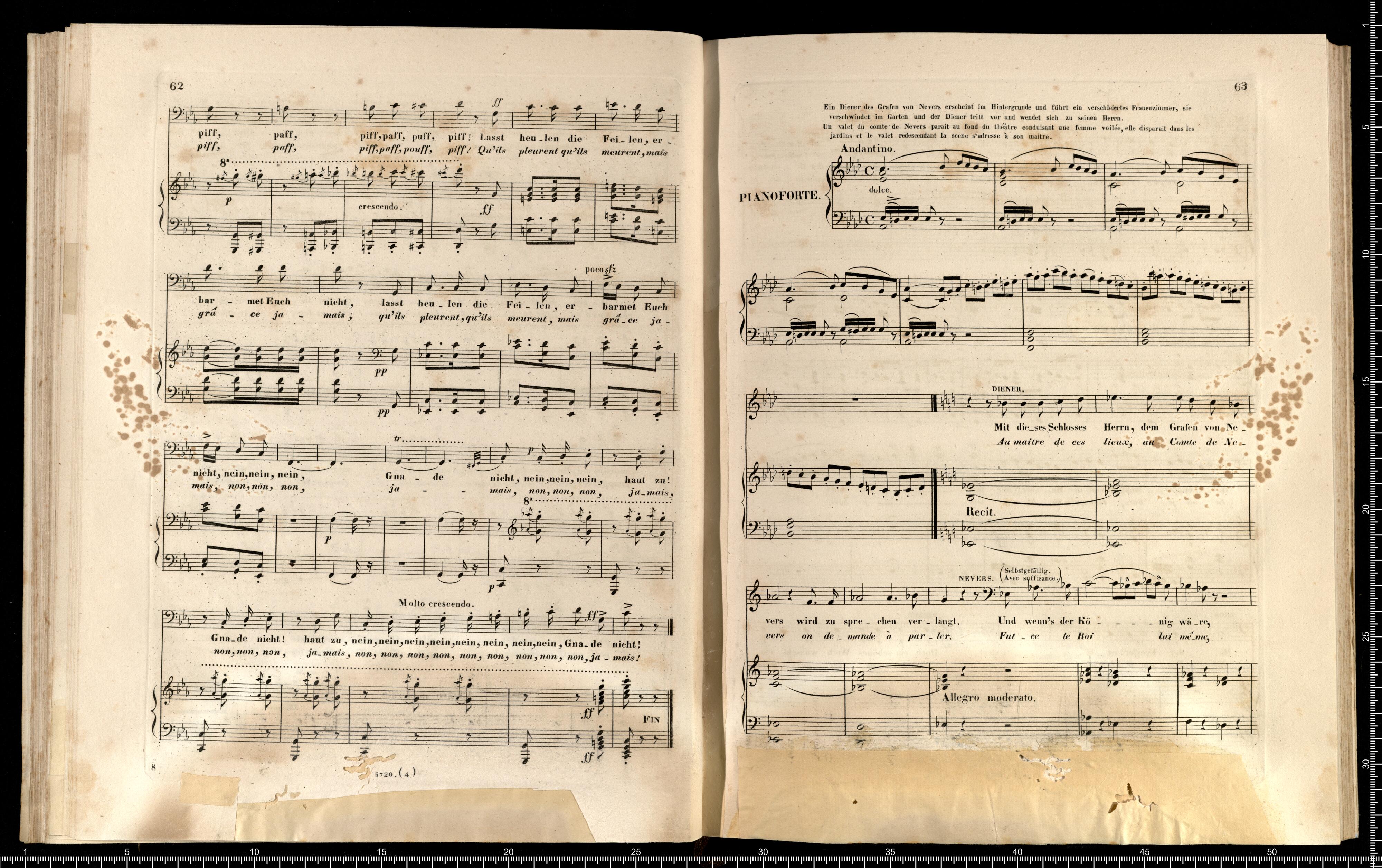 Die Hugenotten | (LES HUGUENOTS) | Grosse Oper in fünf Aufzügen | von E. Scribe | mit deutscher Übersetzung | von | J. F. CASTELLI | K. K. Landschafts Secretaire | componirt | von | Giacomo Meyerbeer | Kapellmeister am Königl. Preuss. Hofe | Ritter der Ehrenlegion etc. | Vollständiger Klavierauszug. | nach der Originalpartitur | von | CH. SCHWENCKE | MIT DEM PORTRAIT DES COMPONISTEN. | Eigenthum der Verleger. | Leipzig, bei Breitkopf & Härtel. | Paris, bei M. Schlesinger. London, bei Mori & Lavenn. | S|t Petersburg, bei Bernard & Holtz. Moskau, bei Paul Lehnhold. | Pr. 15 Thaler netto