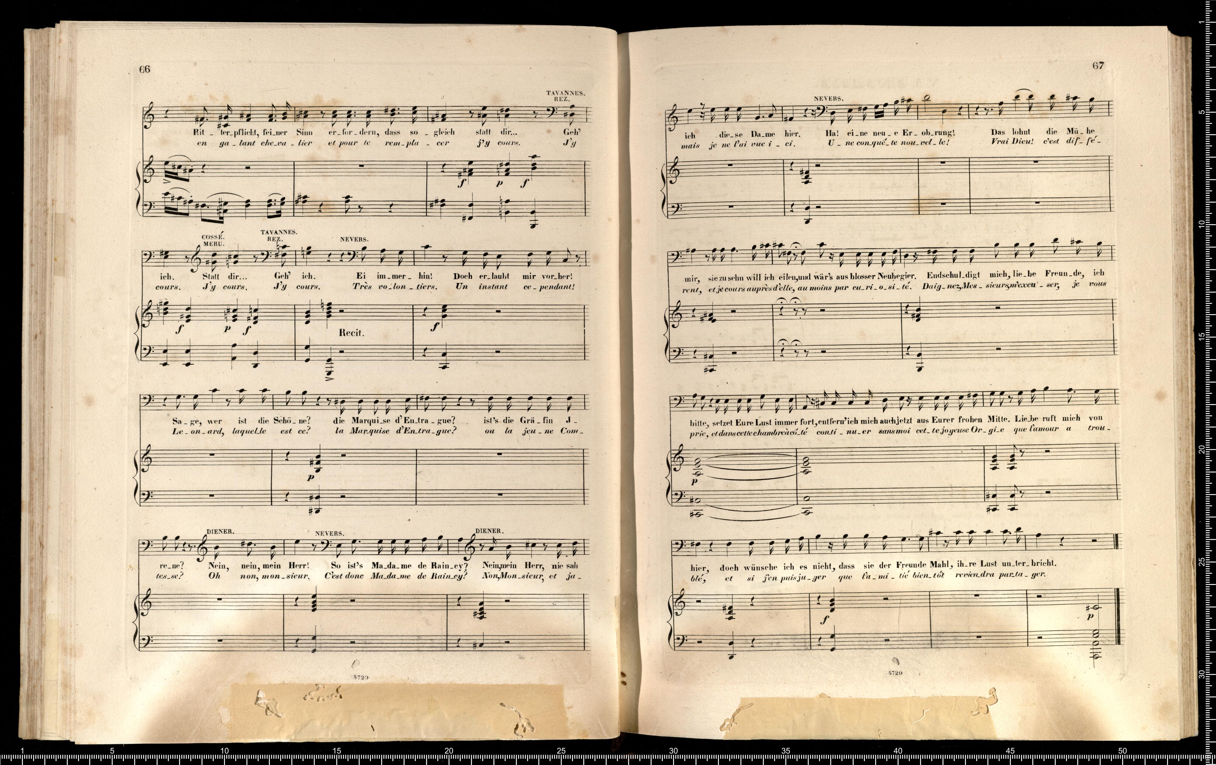 Die Hugenotten | (LES HUGUENOTS) | Grosse Oper in fünf Aufzügen | von E. Scribe | mit deutscher Übersetzung | von | J. F. CASTELLI | K. K. Landschafts Secretaire | componirt | von | Giacomo Meyerbeer | Kapellmeister am Königl. Preuss. Hofe | Ritter der Ehrenlegion etc. | Vollständiger Klavierauszug. | nach der Originalpartitur | von | CH. SCHWENCKE | MIT DEM PORTRAIT DES COMPONISTEN. | Eigenthum der Verleger. | Leipzig, bei Breitkopf & Härtel. | Paris, bei M. Schlesinger. London, bei Mori & Lavenn. | S|t Petersburg, bei Bernard & Holtz. Moskau, bei Paul Lehnhold. | Pr. 15 Thaler netto