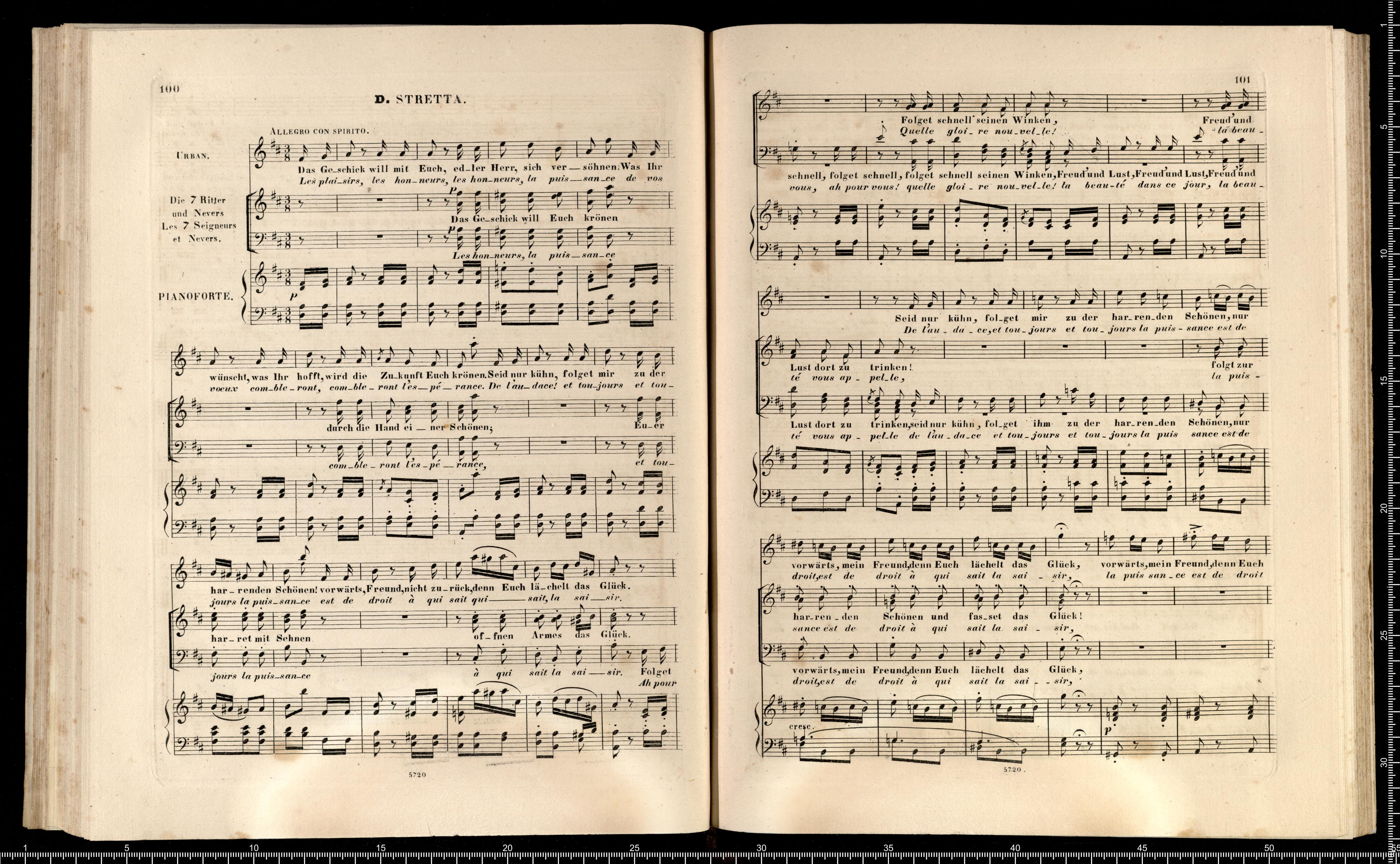Die Hugenotten | (LES HUGUENOTS) | Grosse Oper in fünf Aufzügen | von E. Scribe | mit deutscher Übersetzung | von | J. F. CASTELLI | K. K. Landschafts Secretaire | componirt | von | Giacomo Meyerbeer | Kapellmeister am Königl. Preuss. Hofe | Ritter der Ehrenlegion etc. | Vollständiger Klavierauszug. | nach der Originalpartitur | von | CH. SCHWENCKE | MIT DEM PORTRAIT DES COMPONISTEN. | Eigenthum der Verleger. | Leipzig, bei Breitkopf & Härtel. | Paris, bei M. Schlesinger. London, bei Mori & Lavenn. | S|t Petersburg, bei Bernard & Holtz. Moskau, bei Paul Lehnhold. | Pr. 15 Thaler netto