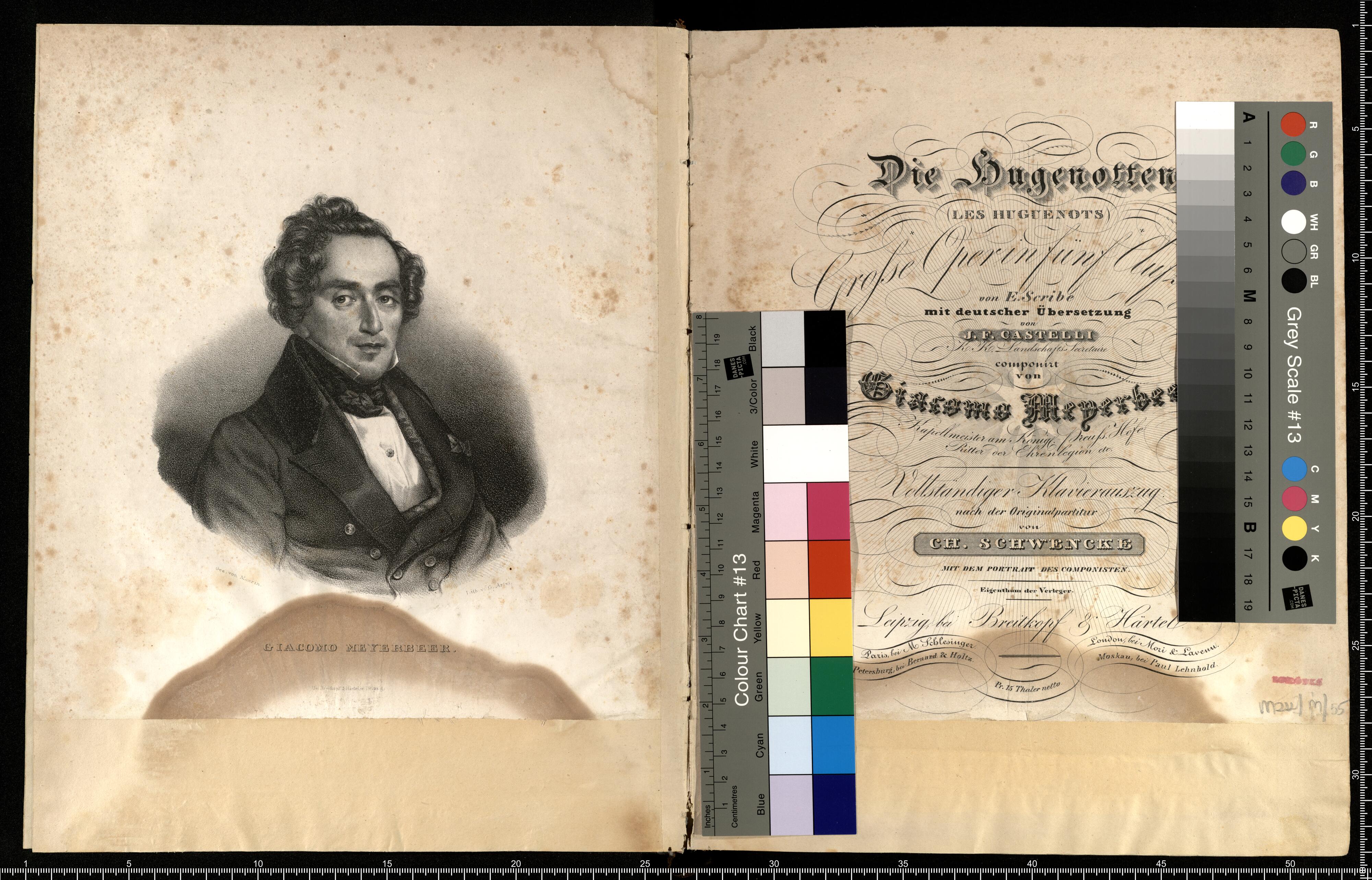 Die Hugenotten | (LES HUGUENOTS) | Grosse Oper in fünf Aufzügen | von E. Scribe | mit deutscher Übersetzung | von | J. F. CASTELLI | K. K. Landschafts Secretaire | componirt | von | Giacomo Meyerbeer | Kapellmeister am Königl. Preuss. Hofe | Ritter der Ehrenlegion etc. | Vollständiger Klavierauszug. | nach der Originalpartitur | von | CH. SCHWENCKE | MIT DEM PORTRAIT DES COMPONISTEN. | Eigenthum der Verleger. | Leipzig, bei Breitkopf & Härtel. | Paris, bei M. Schlesinger. London, bei Mori & Lavenn. | S|t Petersburg, bei Bernard & Holtz. Moskau, bei Paul Lehnhold. | Pr. 15 Thaler netto