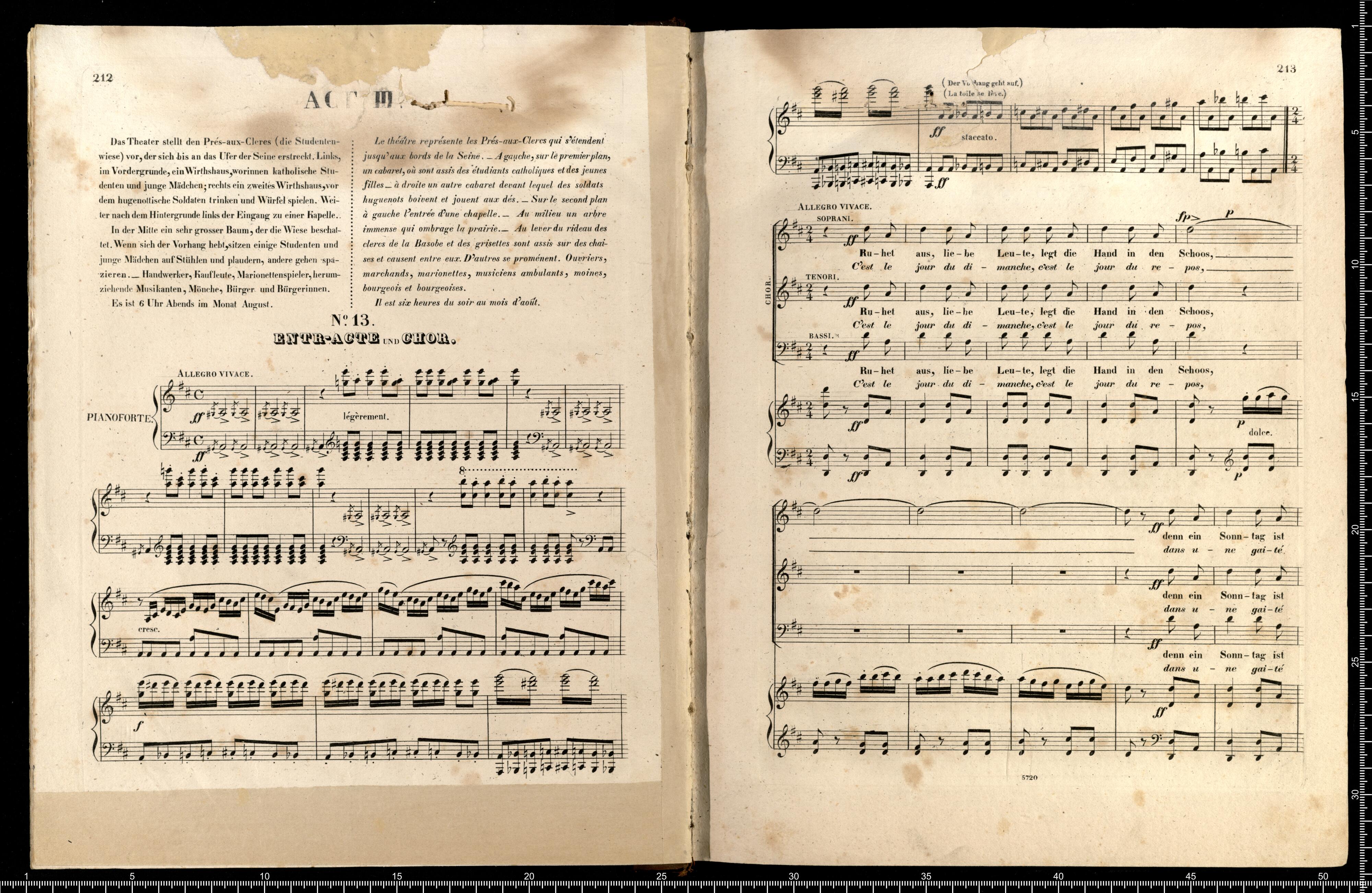Die Hugenotten | (LES HUGUENOTS) | Grosse Oper in fünf Aufzügen | von E. Scribe | mit deutscher Übersetzung | von | J. F. CASTELLI | K. K. Landschafts Secretaire | componirt | von | Giacomo Meyerbeer | Kapellmeister am Königl. Preuss. Hofe | Ritter der Ehrenlegion etc. | Vollständiger Klavierauszug. | nach der Originalpartitur | von | CH. SCHWENCKE | MIT DEM PORTRAIT DES COMPONISTEN. | Eigenthum der Verleger. | Leipzig, bei Breitkopf & Härtel. | Paris, bei M. Schlesinger. London, bei Mori & Lavenn. | S|t Petersburg, bei Bernard & Holtz. Moskau, bei Paul Lehnhold. | Pr. 15 Thaler netto. | Eingetragen in das Vereins-Archiv. | Lith. bei Fr. Krätzschmer in Leipzig