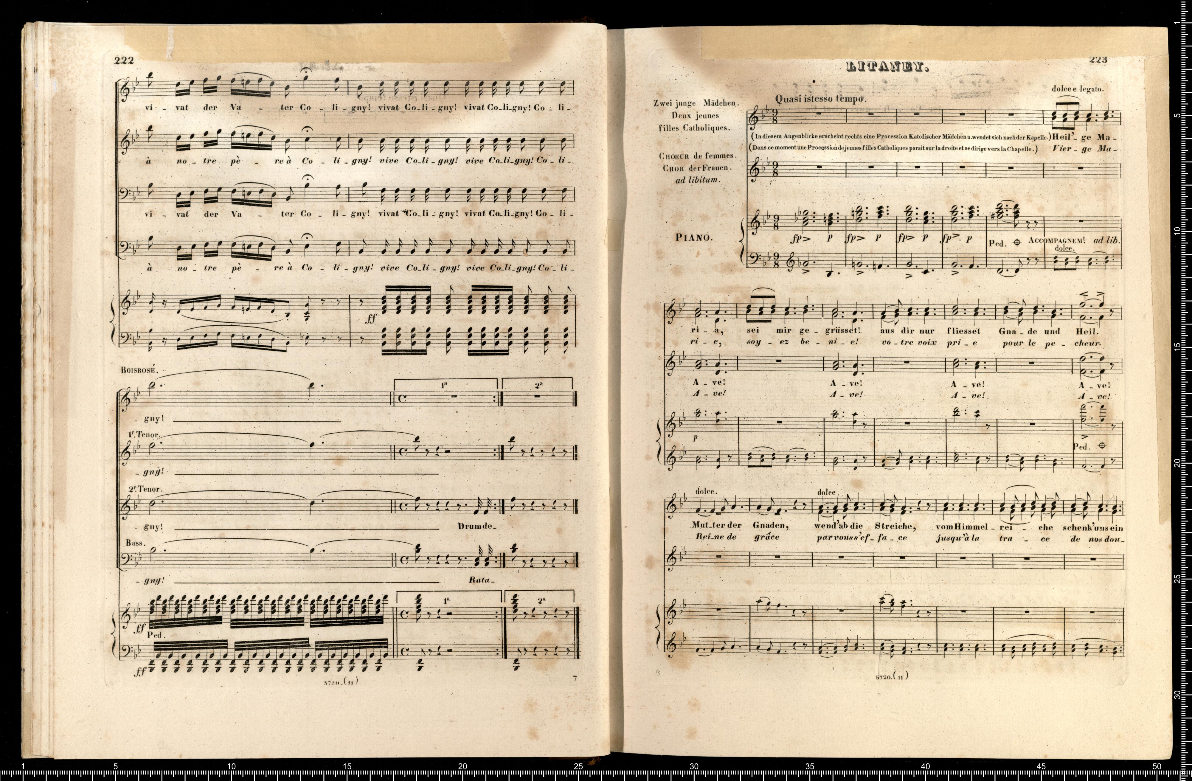 Die Hugenotten | (LES HUGUENOTS) | Grosse Oper in fünf Aufzügen | von E. Scribe | mit deutscher Übersetzung | von | J. F. CASTELLI | K. K. Landschafts Secretaire | componirt | von | Giacomo Meyerbeer | Kapellmeister am Königl. Preuss. Hofe | Ritter der Ehrenlegion etc. | Vollständiger Klavierauszug. | nach der Originalpartitur | von | CH. SCHWENCKE | MIT DEM PORTRAIT DES COMPONISTEN. | Eigenthum der Verleger. | Leipzig, bei Breitkopf & Härtel. | Paris, bei M. Schlesinger. London, bei Mori & Lavenn. | S|t Petersburg, bei Bernard & Holtz. Moskau, bei Paul Lehnhold. | Pr. 15 Thaler netto. | Eingetragen in das Vereins-Archiv. | Lith. bei Fr. Krätzschmer in Leipzig