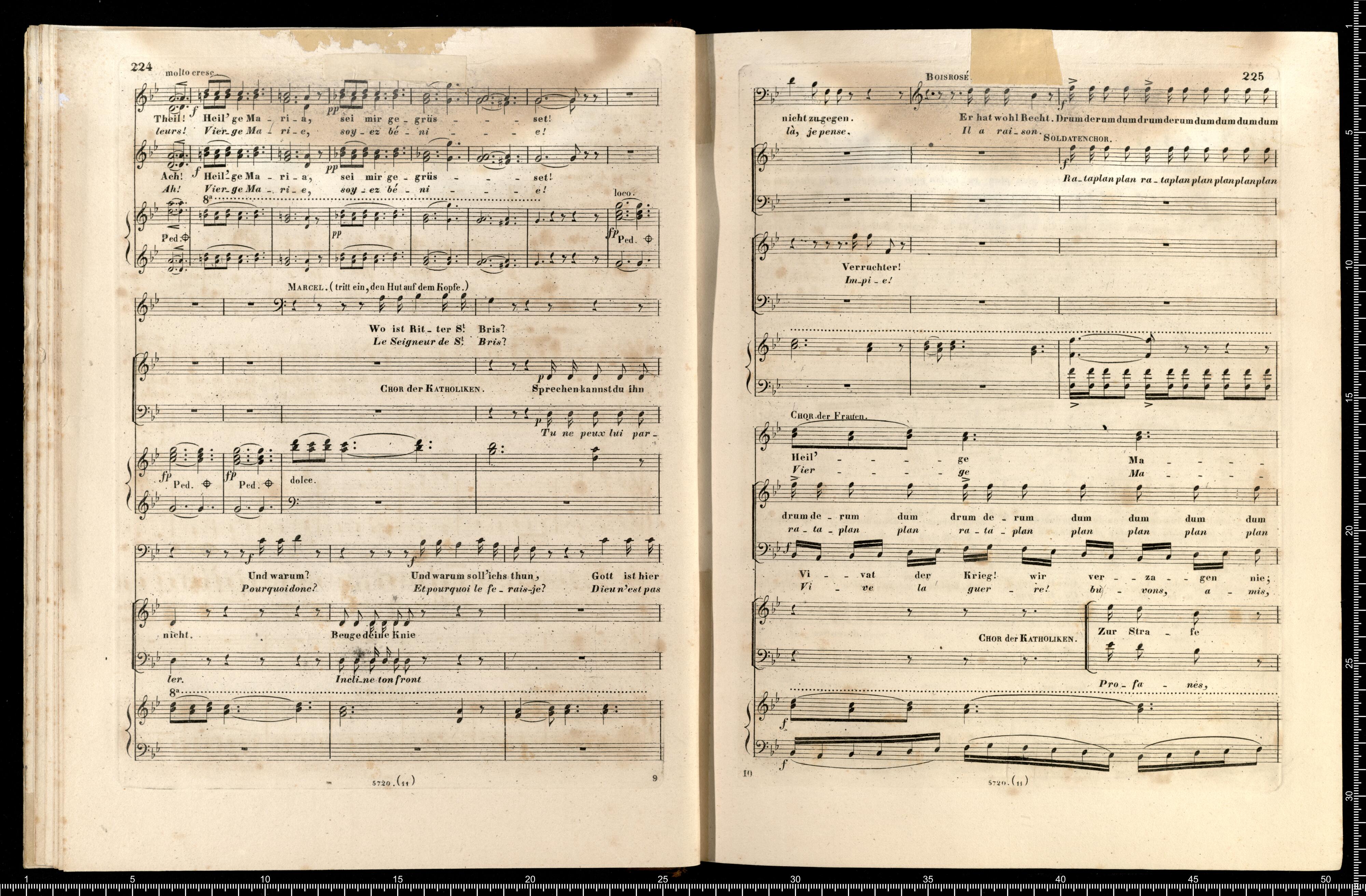 Die Hugenotten | (LES HUGUENOTS) | Grosse Oper in fünf Aufzügen | von E. Scribe | mit deutscher Übersetzung | von | J. F. CASTELLI | K. K. Landschafts Secretaire | componirt | von | Giacomo Meyerbeer | Kapellmeister am Königl. Preuss. Hofe | Ritter der Ehrenlegion etc. | Vollständiger Klavierauszug. | nach der Originalpartitur | von | CH. SCHWENCKE | MIT DEM PORTRAIT DES COMPONISTEN. | Eigenthum der Verleger. | Leipzig, bei Breitkopf & Härtel. | Paris, bei M. Schlesinger. London, bei Mori & Lavenn. | S|t Petersburg, bei Bernard & Holtz. Moskau, bei Paul Lehnhold. | Pr. 15 Thaler netto. | Eingetragen in das Vereins-Archiv. | Lith. bei Fr. Krätzschmer in Leipzig