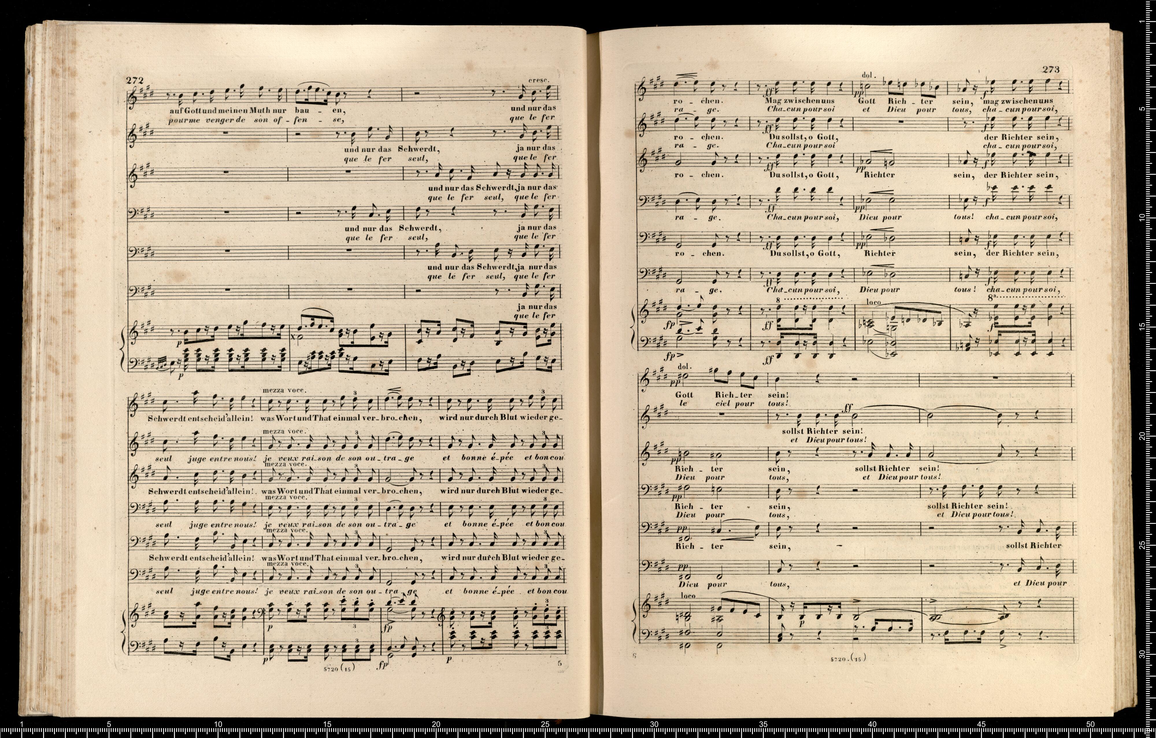 Die Hugenotten | (LES HUGUENOTS) | Grosse Oper in fünf Aufzügen | von E. Scribe | mit deutscher Übersetzung | von | J. F. CASTELLI | K. K. Landschafts Secretaire | componirt | von | Giacomo Meyerbeer | Kapellmeister am Königl. Preuss. Hofe | Ritter der Ehrenlegion etc. | Vollständiger Klavierauszug. | nach der Originalpartitur | von | CH. SCHWENCKE | MIT DEM PORTRAIT DES COMPONISTEN. | Eigenthum der Verleger. | Leipzig, bei Breitkopf & Härtel. | Paris, bei M. Schlesinger. London, bei Mori & Lavenn. | S|t Petersburg, bei Bernard & Holtz. Moskau, bei Paul Lehnhold. | Pr. 15 Thaler netto. | Eingetragen in das Vereins-Archiv. | Lith. bei Fr. Krätzschmer in Leipzig