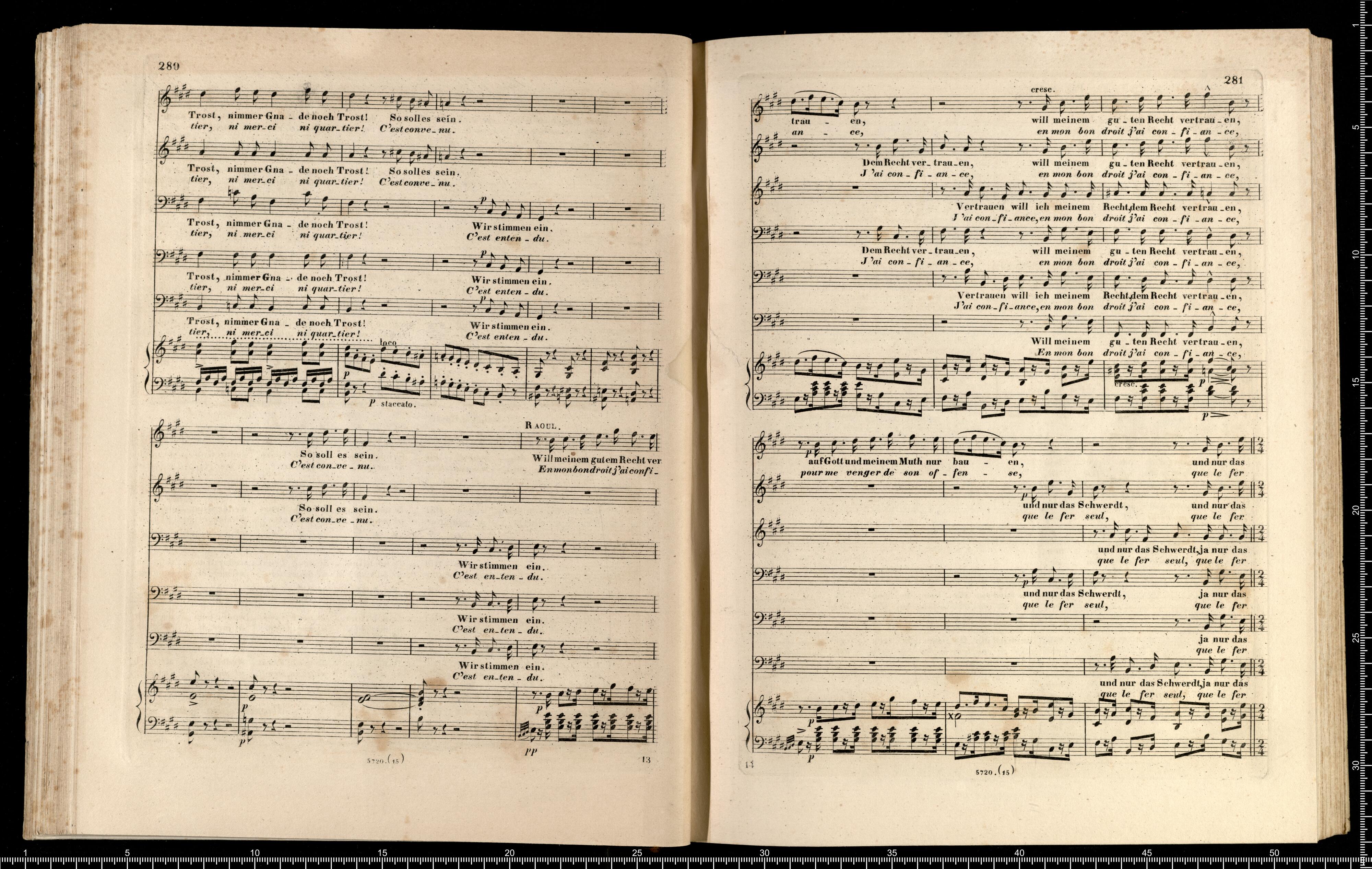 Die Hugenotten | (LES HUGUENOTS) | Grosse Oper in fünf Aufzügen | von E. Scribe | mit deutscher Übersetzung | von | J. F. CASTELLI | K. K. Landschafts Secretaire | componirt | von | Giacomo Meyerbeer | Kapellmeister am Königl. Preuss. Hofe | Ritter der Ehrenlegion etc. | Vollständiger Klavierauszug. | nach der Originalpartitur | von | CH. SCHWENCKE | MIT DEM PORTRAIT DES COMPONISTEN. | Eigenthum der Verleger. | Leipzig, bei Breitkopf & Härtel. | Paris, bei M. Schlesinger. London, bei Mori & Lavenn. | S|t Petersburg, bei Bernard & Holtz. Moskau, bei Paul Lehnhold. | Pr. 15 Thaler netto. | Eingetragen in das Vereins-Archiv. | Lith. bei Fr. Krätzschmer in Leipzig