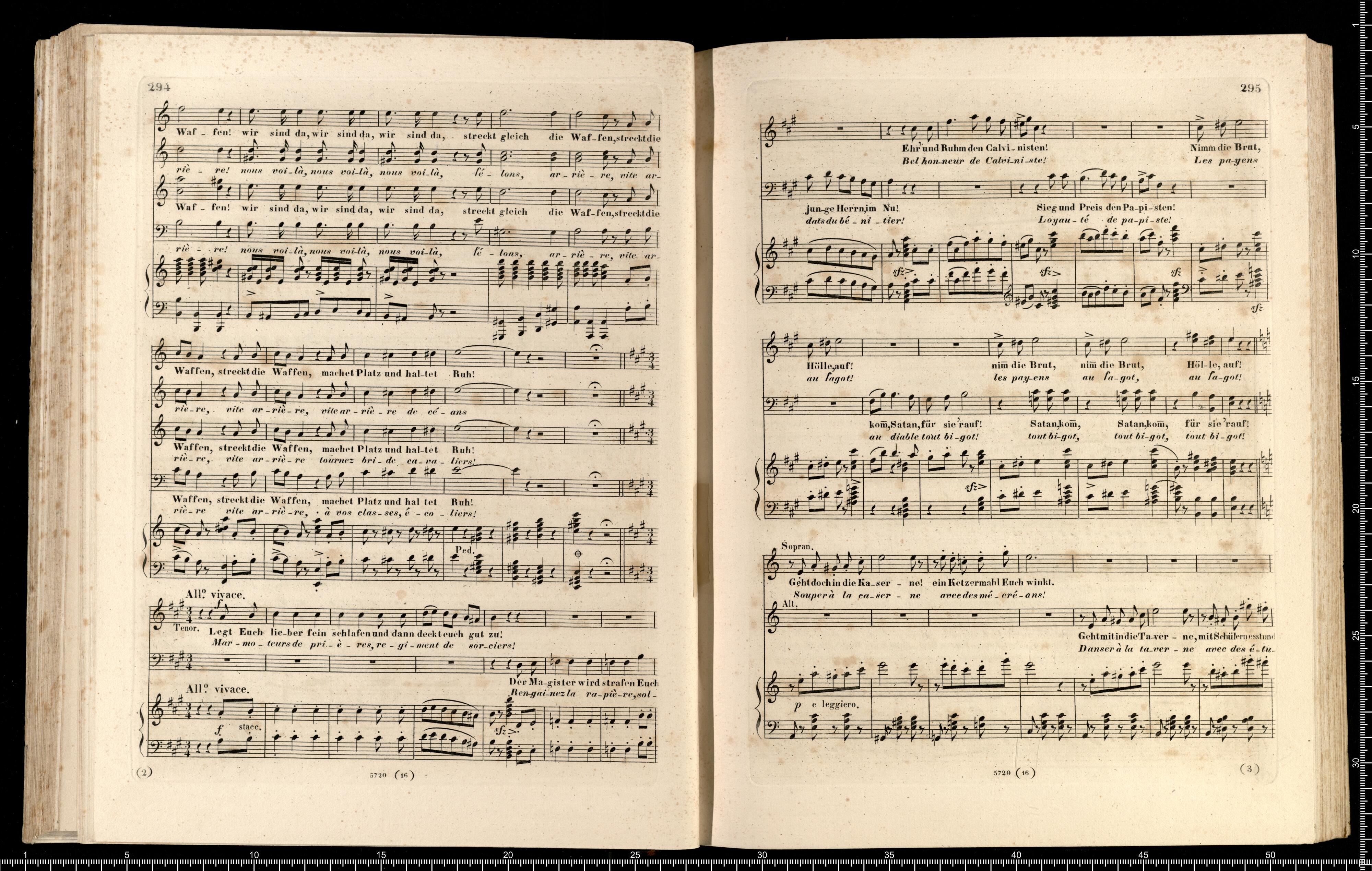 Die Hugenotten | (LES HUGUENOTS) | Grosse Oper in fünf Aufzügen | von E. Scribe | mit deutscher Übersetzung | von | J. F. CASTELLI | K. K. Landschafts Secretaire | componirt | von | Giacomo Meyerbeer | Kapellmeister am Königl. Preuss. Hofe | Ritter der Ehrenlegion etc. | Vollständiger Klavierauszug. | nach der Originalpartitur | von | CH. SCHWENCKE | MIT DEM PORTRAIT DES COMPONISTEN. | Eigenthum der Verleger. | Leipzig, bei Breitkopf & Härtel. | Paris, bei M. Schlesinger. London, bei Mori & Lavenn. | S|t Petersburg, bei Bernard & Holtz. Moskau, bei Paul Lehnhold. | Pr. 15 Thaler netto. | Eingetragen in das Vereins-Archiv. | Lith. bei Fr. Krätzschmer in Leipzig
