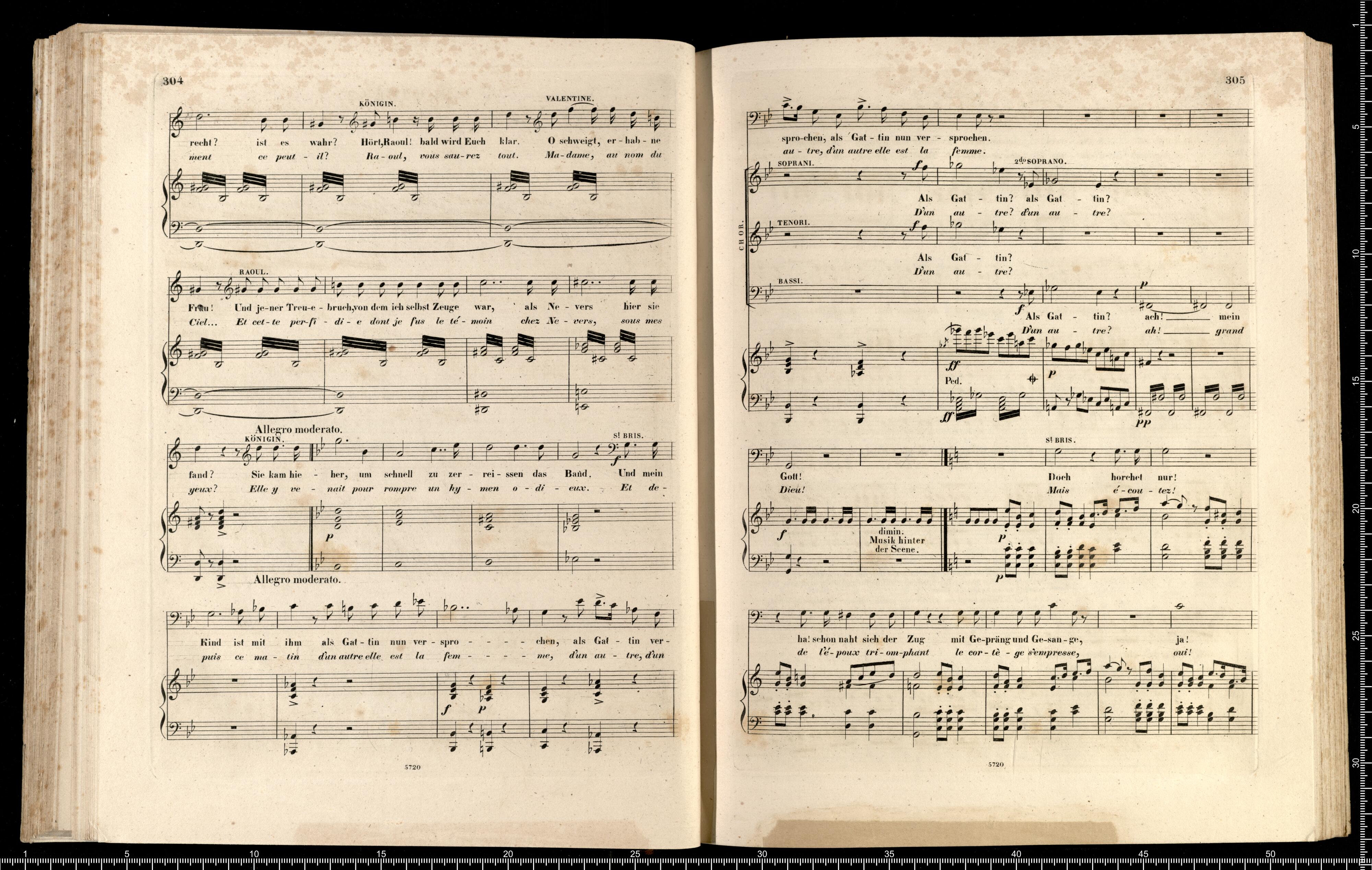 Die Hugenotten | (LES HUGUENOTS) | Grosse Oper in fünf Aufzügen | von E. Scribe | mit deutscher Übersetzung | von | J. F. CASTELLI | K. K. Landschafts Secretaire | componirt | von | Giacomo Meyerbeer | Kapellmeister am Königl. Preuss. Hofe | Ritter der Ehrenlegion etc. | Vollständiger Klavierauszug. | nach der Originalpartitur | von | CH. SCHWENCKE | MIT DEM PORTRAIT DES COMPONISTEN. | Eigenthum der Verleger. | Leipzig, bei Breitkopf & Härtel. | Paris, bei M. Schlesinger. London, bei Mori & Lavenn. | S|t Petersburg, bei Bernard & Holtz. Moskau, bei Paul Lehnhold. | Pr. 15 Thaler netto. | Eingetragen in das Vereins-Archiv. | Lith. bei Fr. Krätzschmer in Leipzig