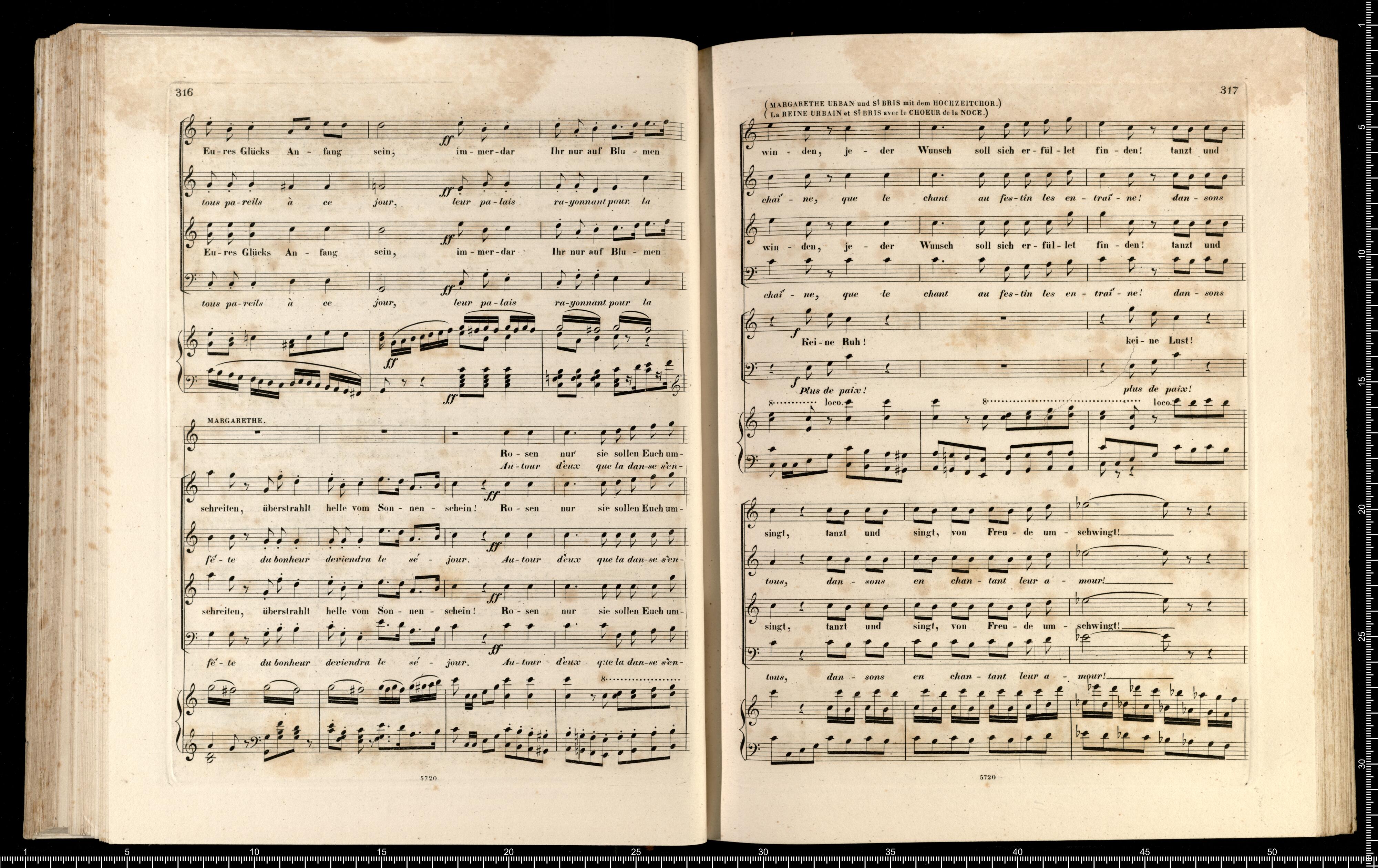 Die Hugenotten | (LES HUGUENOTS) | Grosse Oper in fünf Aufzügen | von E. Scribe | mit deutscher Übersetzung | von | J. F. CASTELLI | K. K. Landschafts Secretaire | componirt | von | Giacomo Meyerbeer | Kapellmeister am Königl. Preuss. Hofe | Ritter der Ehrenlegion etc. | Vollständiger Klavierauszug. | nach der Originalpartitur | von | CH. SCHWENCKE | MIT DEM PORTRAIT DES COMPONISTEN. | Eigenthum der Verleger. | Leipzig, bei Breitkopf & Härtel. | Paris, bei M. Schlesinger. London, bei Mori & Lavenn. | S|t Petersburg, bei Bernard & Holtz. Moskau, bei Paul Lehnhold. | Pr. 15 Thaler netto. | Eingetragen in das Vereins-Archiv. | Lith. bei Fr. Krätzschmer in Leipzig
