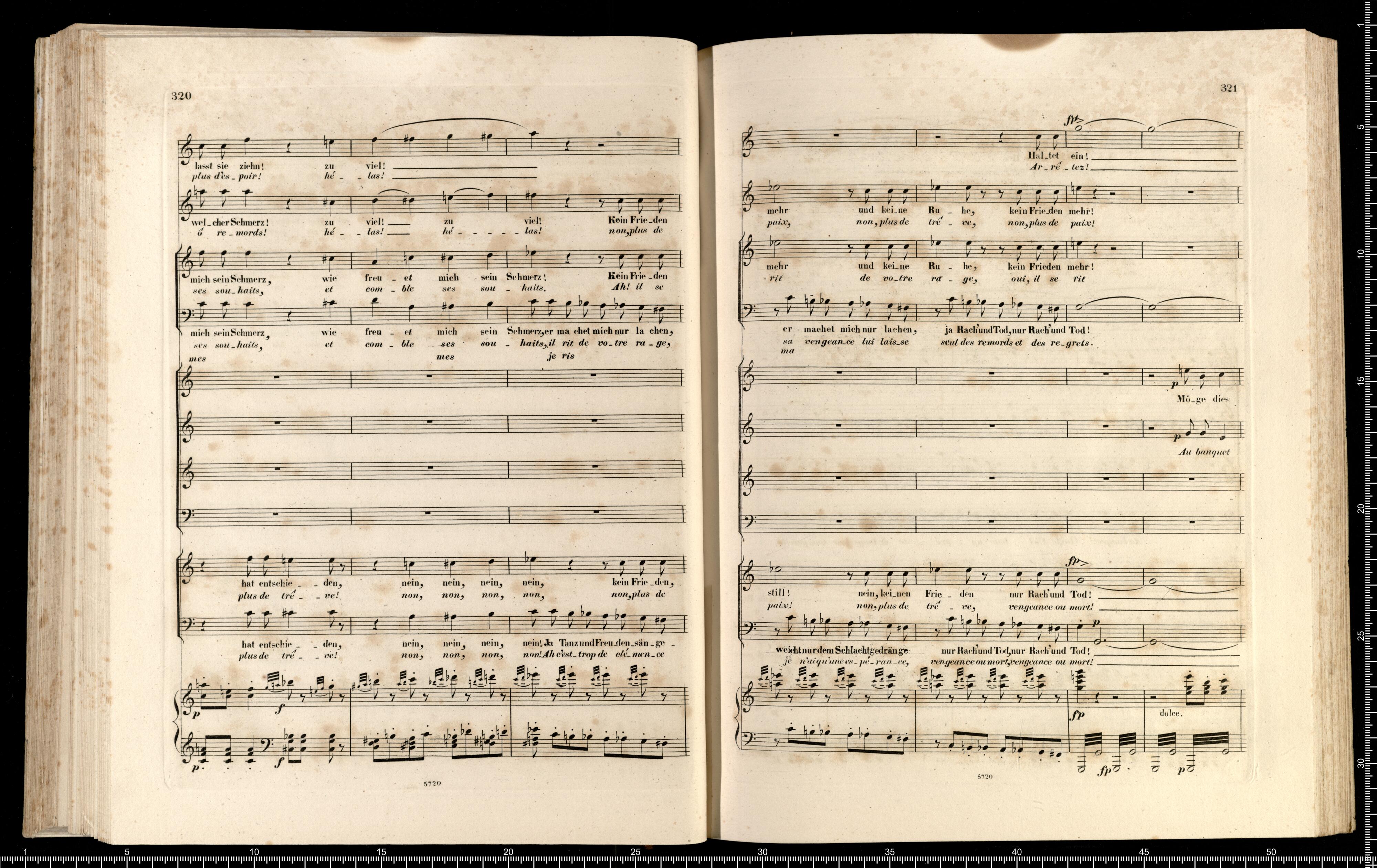 Die Hugenotten | (LES HUGUENOTS) | Grosse Oper in fünf Aufzügen | von E. Scribe | mit deutscher Übersetzung | von | J. F. CASTELLI | K. K. Landschafts Secretaire | componirt | von | Giacomo Meyerbeer | Kapellmeister am Königl. Preuss. Hofe | Ritter der Ehrenlegion etc. | Vollständiger Klavierauszug. | nach der Originalpartitur | von | CH. SCHWENCKE | MIT DEM PORTRAIT DES COMPONISTEN. | Eigenthum der Verleger. | Leipzig, bei Breitkopf & Härtel. | Paris, bei M. Schlesinger. London, bei Mori & Lavenn. | S|t Petersburg, bei Bernard & Holtz. Moskau, bei Paul Lehnhold. | Pr. 15 Thaler netto. | Eingetragen in das Vereins-Archiv. | Lith. bei Fr. Krätzschmer in Leipzig