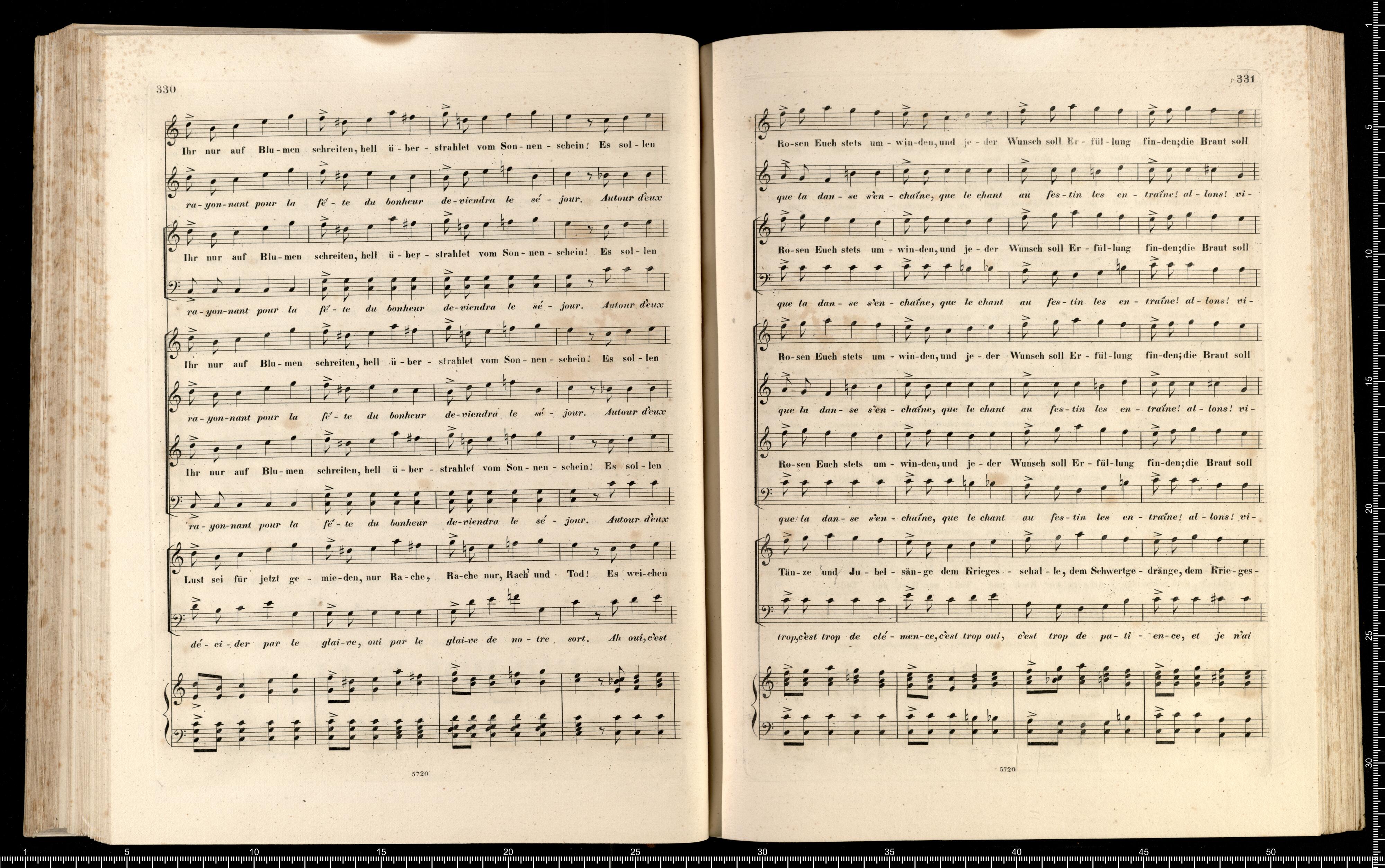 Die Hugenotten | (LES HUGUENOTS) | Grosse Oper in fünf Aufzügen | von E. Scribe | mit deutscher Übersetzung | von | J. F. CASTELLI | K. K. Landschafts Secretaire | componirt | von | Giacomo Meyerbeer | Kapellmeister am Königl. Preuss. Hofe | Ritter der Ehrenlegion etc. | Vollständiger Klavierauszug. | nach der Originalpartitur | von | CH. SCHWENCKE | MIT DEM PORTRAIT DES COMPONISTEN. | Eigenthum der Verleger. | Leipzig, bei Breitkopf & Härtel. | Paris, bei M. Schlesinger. London, bei Mori & Lavenn. | S|t Petersburg, bei Bernard & Holtz. Moskau, bei Paul Lehnhold. | Pr. 15 Thaler netto. | Eingetragen in das Vereins-Archiv. | Lith. bei Fr. Krätzschmer in Leipzig