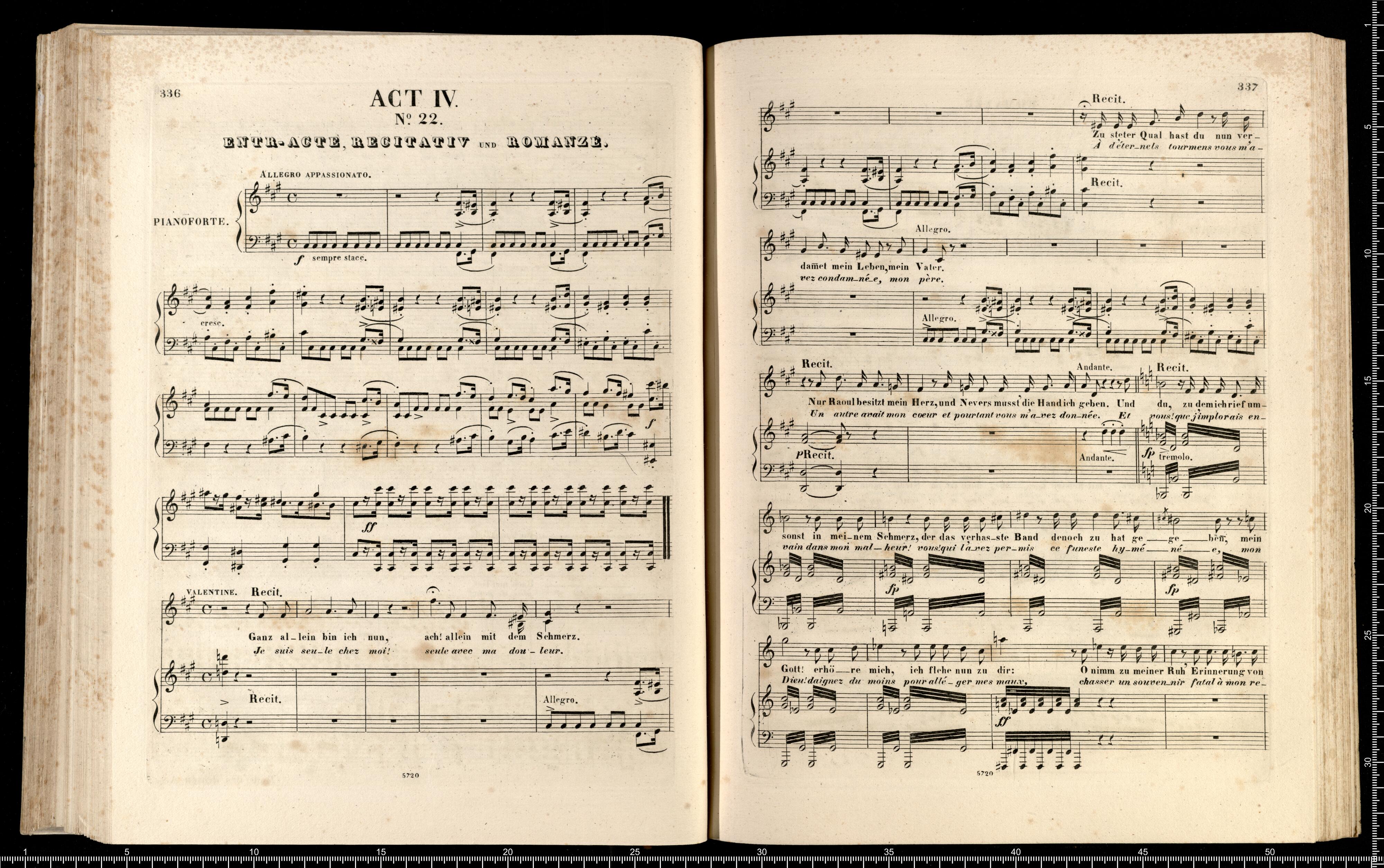 Die Hugenotten | (LES HUGUENOTS) | Grosse Oper in fünf Aufzügen | von E. Scribe | mit deutscher Übersetzung | von | J. F. CASTELLI | K. K. Landschafts Secretaire | componirt | von | Giacomo Meyerbeer | Kapellmeister am Königl. Preuss. Hofe | Ritter der Ehrenlegion etc. | Vollständiger Klavierauszug. | nach der Originalpartitur | von | CH. SCHWENCKE | MIT DEM PORTRAIT DES COMPONISTEN. | Eigenthum der Verleger. | Leipzig, bei Breitkopf & Härtel. | Paris, bei M. Schlesinger. London, bei Mori & Lavenn. | S|t Petersburg, bei Bernard & Holtz. Moskau, bei Paul Lehnhold. | Pr. 15 Thaler netto. | Eingetragen in das Vereins-Archiv. | Lith. bei Fr. Krätzschmer in Leipzig