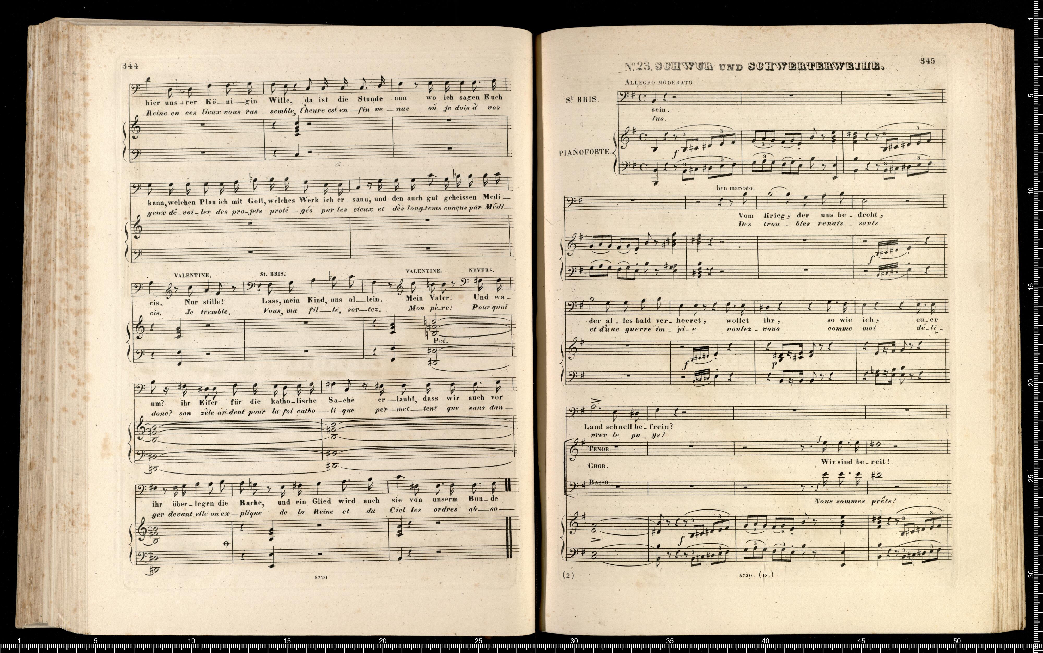 Die Hugenotten | (LES HUGUENOTS) | Grosse Oper in fünf Aufzügen | von E. Scribe | mit deutscher Übersetzung | von | J. F. CASTELLI | K. K. Landschafts Secretaire | componirt | von | Giacomo Meyerbeer | Kapellmeister am Königl. Preuss. Hofe | Ritter der Ehrenlegion etc. | Vollständiger Klavierauszug. | nach der Originalpartitur | von | CH. SCHWENCKE | MIT DEM PORTRAIT DES COMPONISTEN. | Eigenthum der Verleger. | Leipzig, bei Breitkopf & Härtel. | Paris, bei M. Schlesinger. London, bei Mori & Lavenn. | S|t Petersburg, bei Bernard & Holtz. Moskau, bei Paul Lehnhold. | Pr. 15 Thaler netto. | Eingetragen in das Vereins-Archiv. | Lith. bei Fr. Krätzschmer in Leipzig
