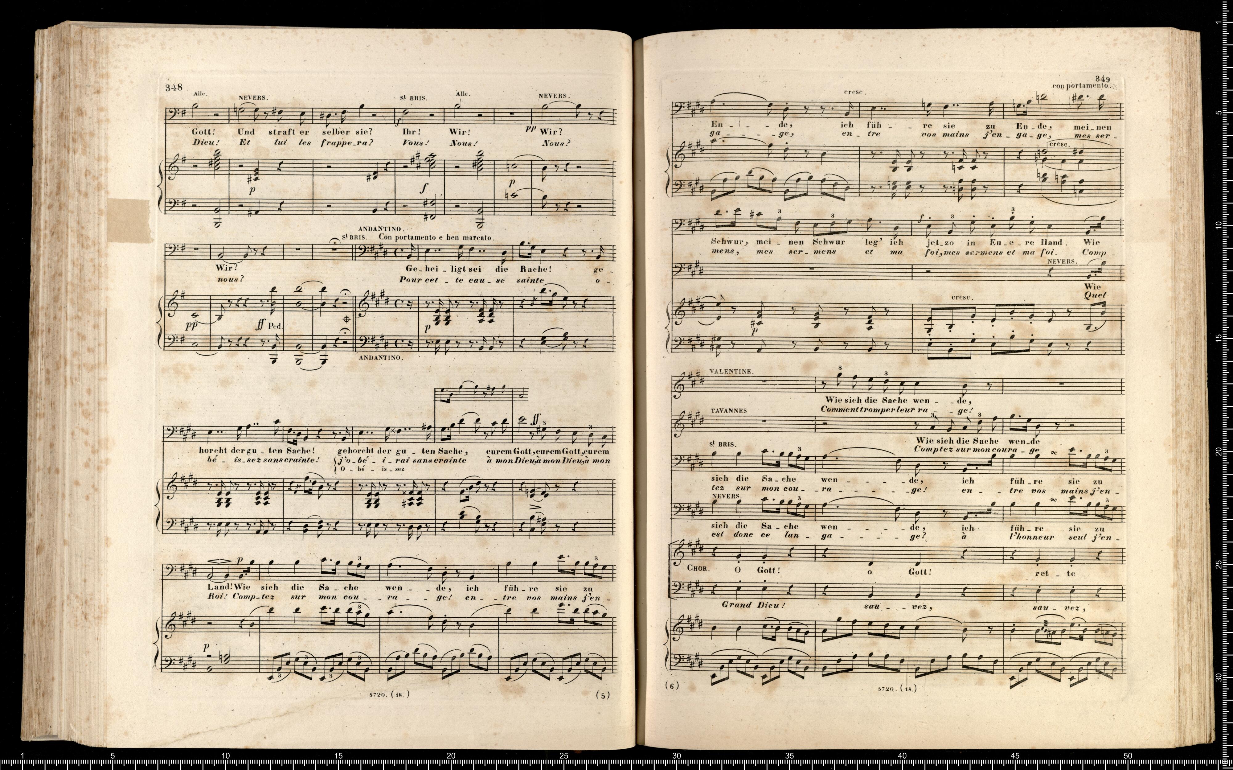 Die Hugenotten | (LES HUGUENOTS) | Grosse Oper in fünf Aufzügen | von E. Scribe | mit deutscher Übersetzung | von | J. F. CASTELLI | K. K. Landschafts Secretaire | componirt | von | Giacomo Meyerbeer | Kapellmeister am Königl. Preuss. Hofe | Ritter der Ehrenlegion etc. | Vollständiger Klavierauszug. | nach der Originalpartitur | von | CH. SCHWENCKE | MIT DEM PORTRAIT DES COMPONISTEN. | Eigenthum der Verleger. | Leipzig, bei Breitkopf & Härtel. | Paris, bei M. Schlesinger. London, bei Mori & Lavenn. | S|t Petersburg, bei Bernard & Holtz. Moskau, bei Paul Lehnhold. | Pr. 15 Thaler netto. | Eingetragen in das Vereins-Archiv. | Lith. bei Fr. Krätzschmer in Leipzig