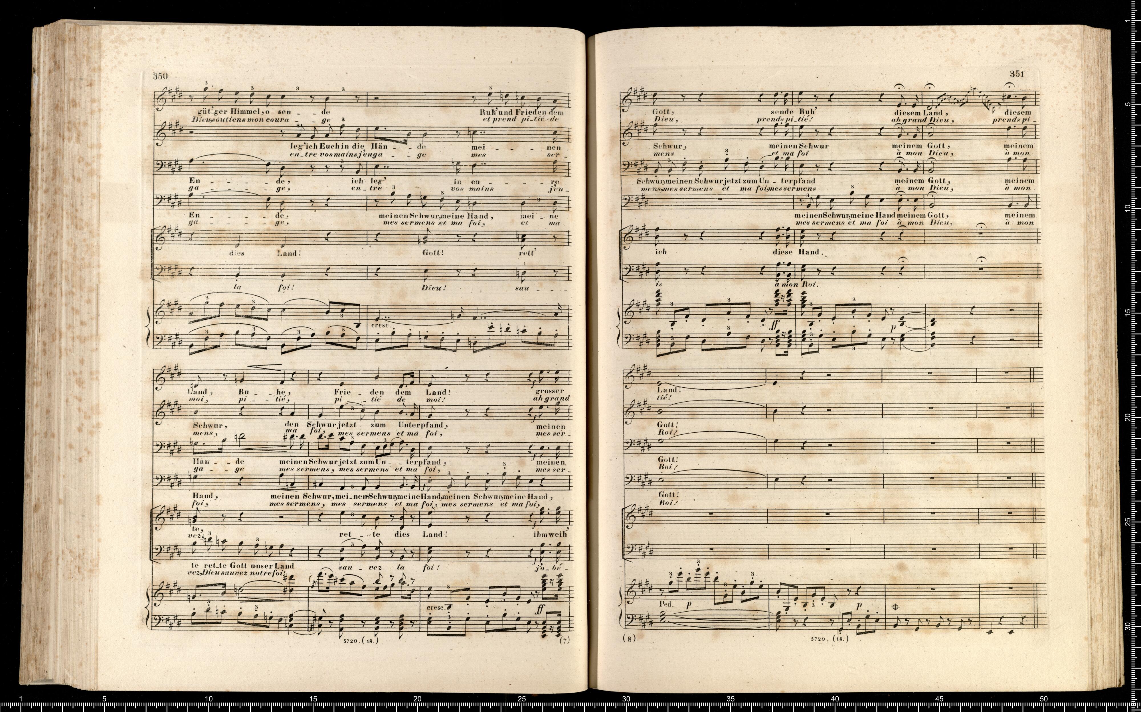 Die Hugenotten | (LES HUGUENOTS) | Grosse Oper in fünf Aufzügen | von E. Scribe | mit deutscher Übersetzung | von | J. F. CASTELLI | K. K. Landschafts Secretaire | componirt | von | Giacomo Meyerbeer | Kapellmeister am Königl. Preuss. Hofe | Ritter der Ehrenlegion etc. | Vollständiger Klavierauszug. | nach der Originalpartitur | von | CH. SCHWENCKE | MIT DEM PORTRAIT DES COMPONISTEN. | Eigenthum der Verleger. | Leipzig, bei Breitkopf & Härtel. | Paris, bei M. Schlesinger. London, bei Mori & Lavenn. | S|t Petersburg, bei Bernard & Holtz. Moskau, bei Paul Lehnhold. | Pr. 15 Thaler netto. | Eingetragen in das Vereins-Archiv. | Lith. bei Fr. Krätzschmer in Leipzig