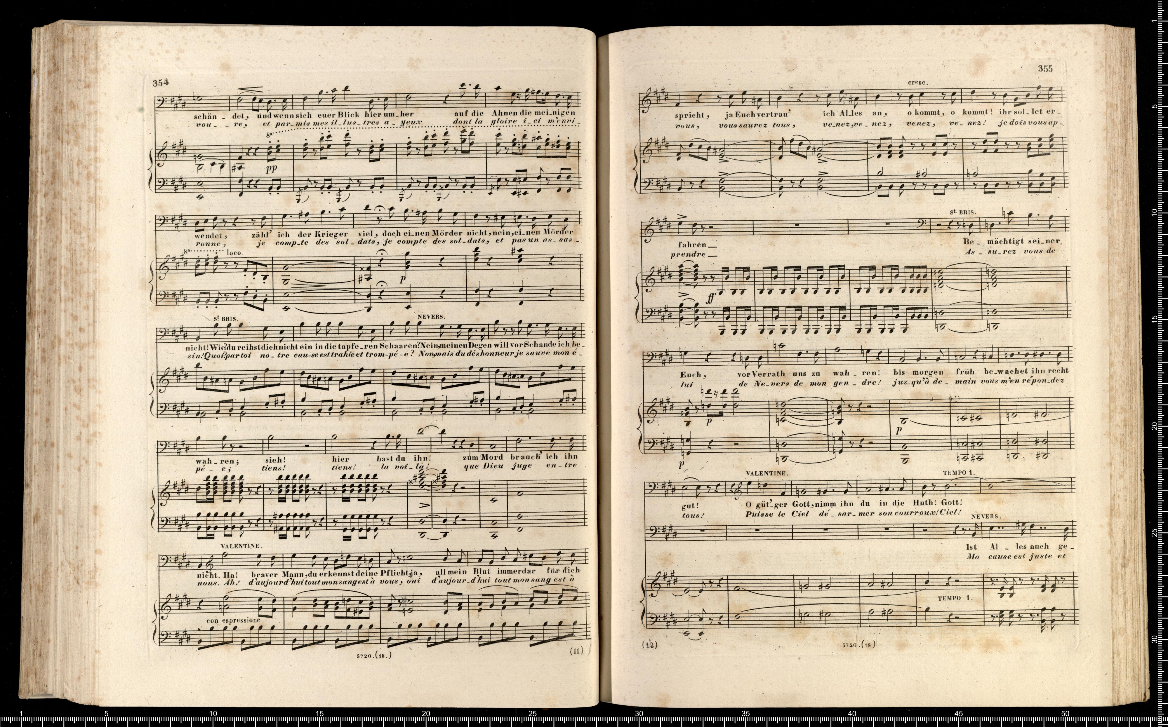Die Hugenotten | (LES HUGUENOTS) | Grosse Oper in fünf Aufzügen | von E. Scribe | mit deutscher Übersetzung | von | J. F. CASTELLI | K. K. Landschafts Secretaire | componirt | von | Giacomo Meyerbeer | Kapellmeister am Königl. Preuss. Hofe | Ritter der Ehrenlegion etc. | Vollständiger Klavierauszug. | nach der Originalpartitur | von | CH. SCHWENCKE | MIT DEM PORTRAIT DES COMPONISTEN. | Eigenthum der Verleger. | Leipzig, bei Breitkopf & Härtel. | Paris, bei M. Schlesinger. London, bei Mori & Lavenn. | S|t Petersburg, bei Bernard & Holtz. Moskau, bei Paul Lehnhold. | Pr. 15 Thaler netto. | Eingetragen in das Vereins-Archiv. | Lith. bei Fr. Krätzschmer in Leipzig