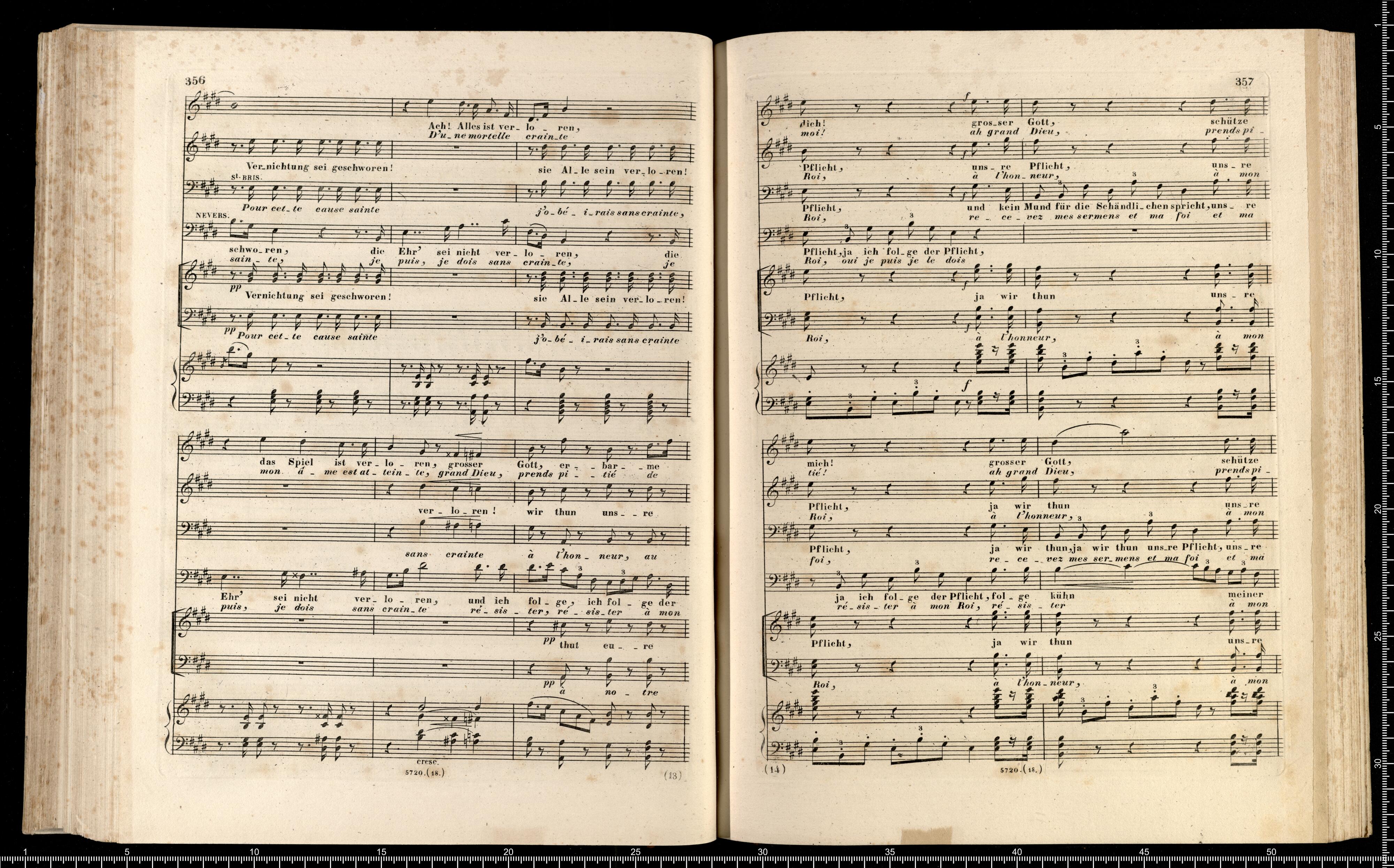 Die Hugenotten | (LES HUGUENOTS) | Grosse Oper in fünf Aufzügen | von E. Scribe | mit deutscher Übersetzung | von | J. F. CASTELLI | K. K. Landschafts Secretaire | componirt | von | Giacomo Meyerbeer | Kapellmeister am Königl. Preuss. Hofe | Ritter der Ehrenlegion etc. | Vollständiger Klavierauszug. | nach der Originalpartitur | von | CH. SCHWENCKE | MIT DEM PORTRAIT DES COMPONISTEN. | Eigenthum der Verleger. | Leipzig, bei Breitkopf & Härtel. | Paris, bei M. Schlesinger. London, bei Mori & Lavenn. | S|t Petersburg, bei Bernard & Holtz. Moskau, bei Paul Lehnhold. | Pr. 15 Thaler netto. | Eingetragen in das Vereins-Archiv. | Lith. bei Fr. Krätzschmer in Leipzig