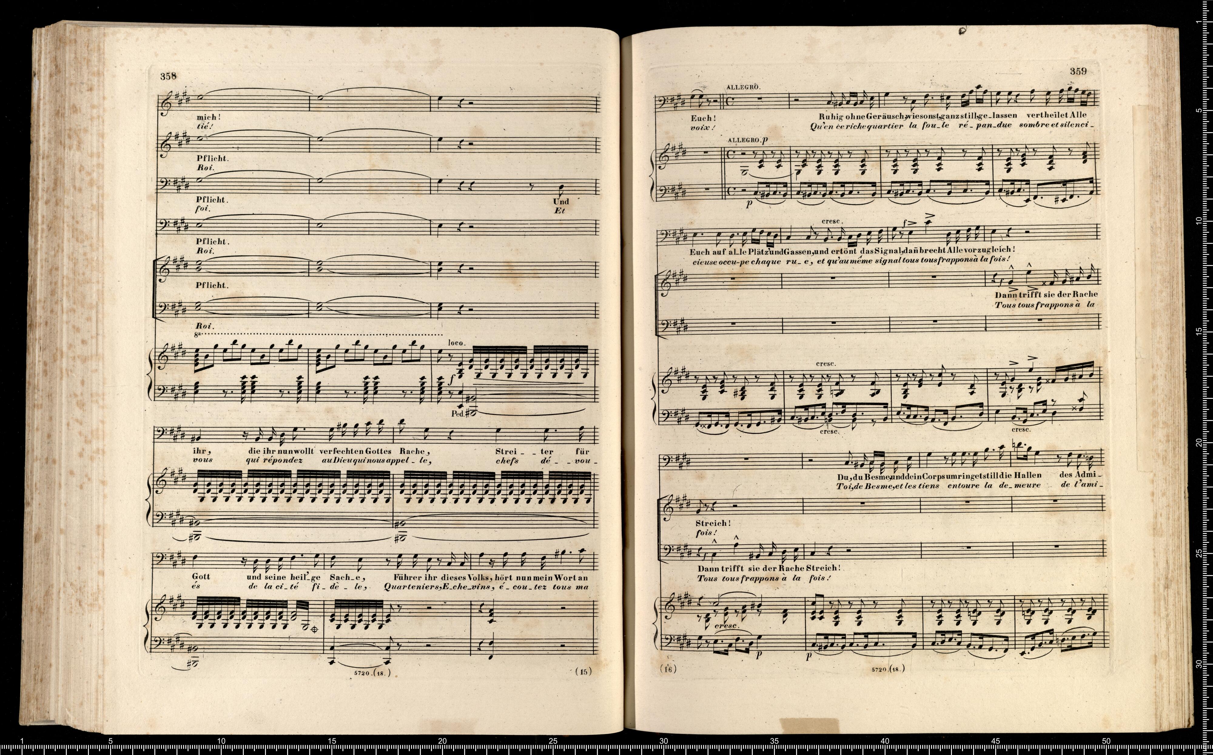 Die Hugenotten | (LES HUGUENOTS) | Grosse Oper in fünf Aufzügen | von E. Scribe | mit deutscher Übersetzung | von | J. F. CASTELLI | K. K. Landschafts Secretaire | componirt | von | Giacomo Meyerbeer | Kapellmeister am Königl. Preuss. Hofe | Ritter der Ehrenlegion etc. | Vollständiger Klavierauszug. | nach der Originalpartitur | von | CH. SCHWENCKE | MIT DEM PORTRAIT DES COMPONISTEN. | Eigenthum der Verleger. | Leipzig, bei Breitkopf & Härtel. | Paris, bei M. Schlesinger. London, bei Mori & Lavenn. | S|t Petersburg, bei Bernard & Holtz. Moskau, bei Paul Lehnhold. | Pr. 15 Thaler netto. | Eingetragen in das Vereins-Archiv. | Lith. bei Fr. Krätzschmer in Leipzig