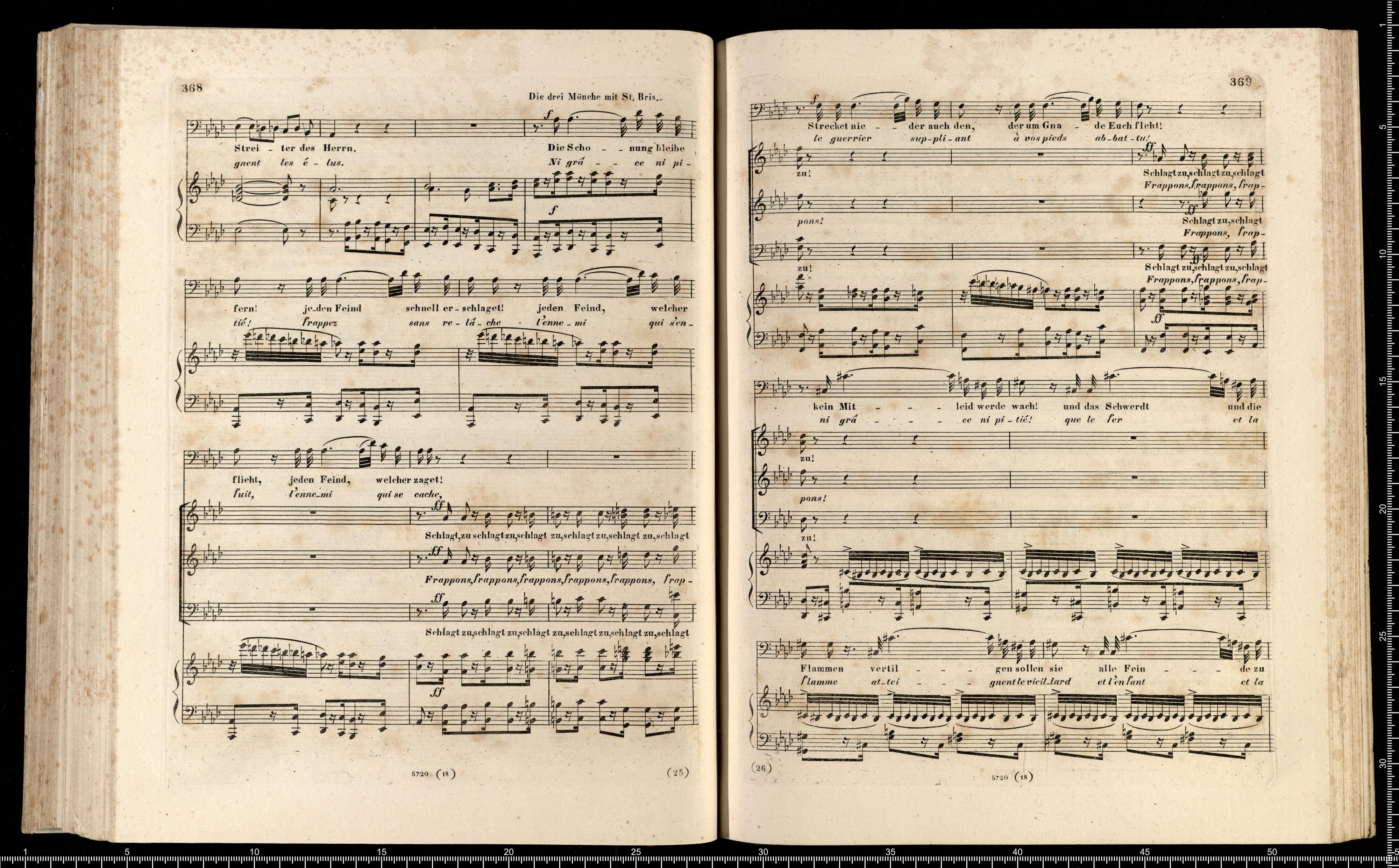 Die Hugenotten | (LES HUGUENOTS) | Grosse Oper in fünf Aufzügen | von E. Scribe | mit deutscher Übersetzung | von | J. F. CASTELLI | K. K. Landschafts Secretaire | componirt | von | Giacomo Meyerbeer | Kapellmeister am Königl. Preuss. Hofe | Ritter der Ehrenlegion etc. | Vollständiger Klavierauszug. | nach der Originalpartitur | von | CH. SCHWENCKE | MIT DEM PORTRAIT DES COMPONISTEN. | Eigenthum der Verleger. | Leipzig, bei Breitkopf & Härtel. | Paris, bei M. Schlesinger. London, bei Mori & Lavenn. | S|t Petersburg, bei Bernard & Holtz. Moskau, bei Paul Lehnhold. | Pr. 15 Thaler netto. | Eingetragen in das Vereins-Archiv. | Lith. bei Fr. Krätzschmer in Leipzig