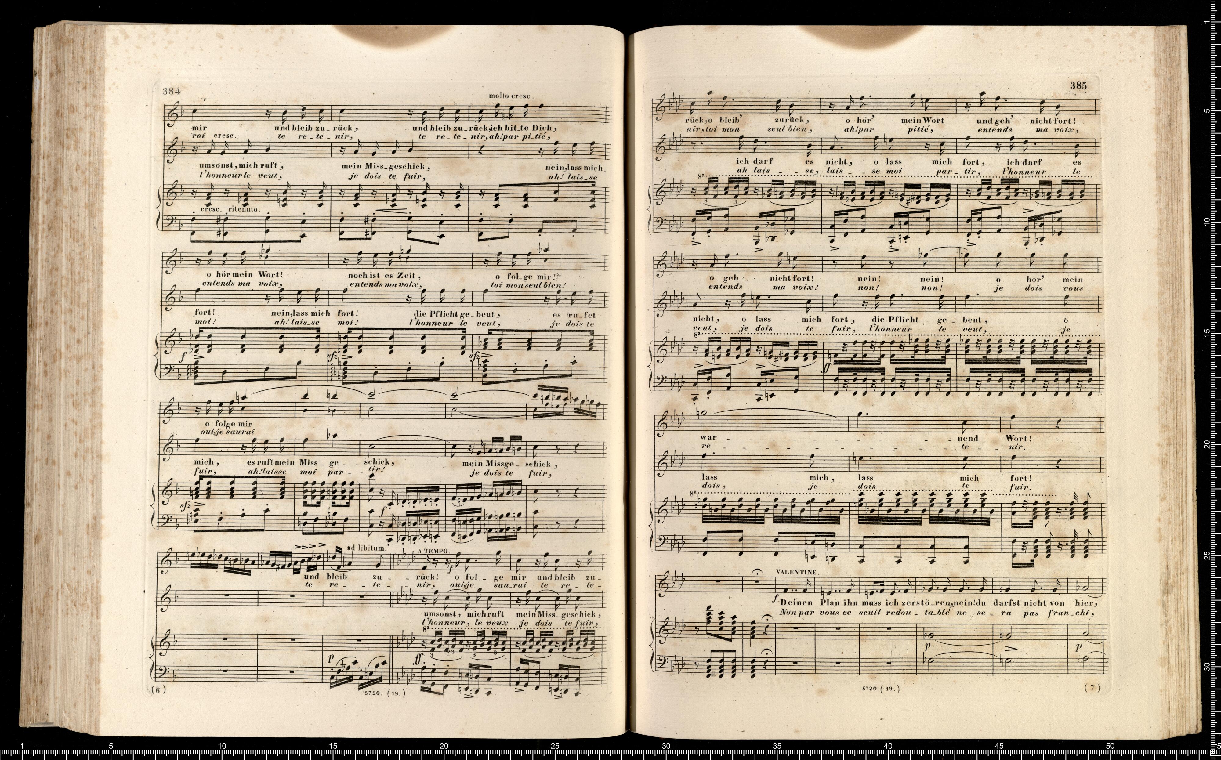 Die Hugenotten | (LES HUGUENOTS) | Grosse Oper in fünf Aufzügen | von E. Scribe | mit deutscher Übersetzung | von | J. F. CASTELLI | K. K. Landschafts Secretaire | componirt | von | Giacomo Meyerbeer | Kapellmeister am Königl. Preuss. Hofe | Ritter der Ehrenlegion etc. | Vollständiger Klavierauszug. | nach der Originalpartitur | von | CH. SCHWENCKE | MIT DEM PORTRAIT DES COMPONISTEN. | Eigenthum der Verleger. | Leipzig, bei Breitkopf & Härtel. | Paris, bei M. Schlesinger. London, bei Mori & Lavenn. | S|t Petersburg, bei Bernard & Holtz. Moskau, bei Paul Lehnhold. | Pr. 15 Thaler netto. | Eingetragen in das Vereins-Archiv. | Lith. bei Fr. Krätzschmer in Leipzig