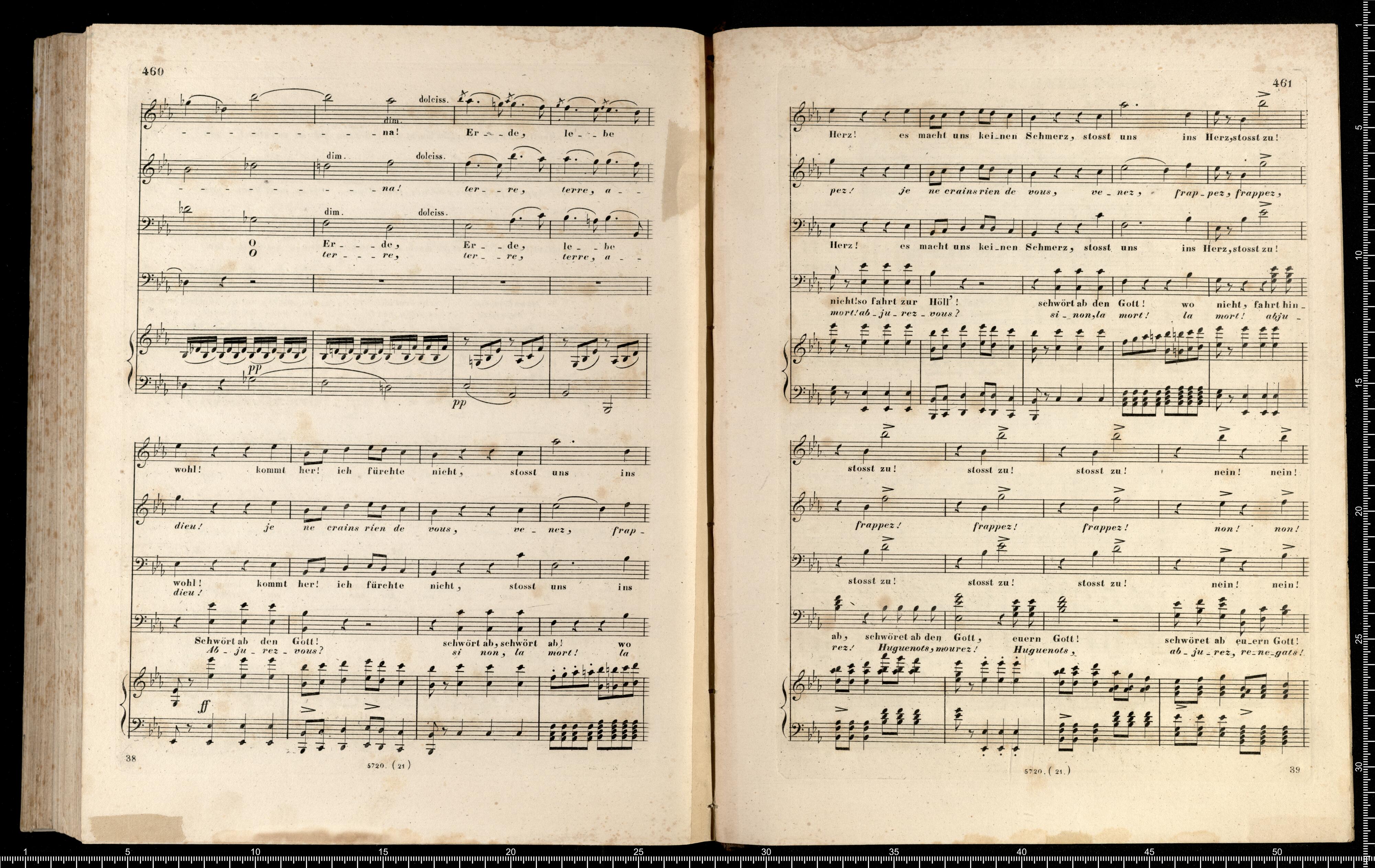 Die Hugenotten | (LES HUGUENOTS) | Grosse Oper in fünf Aufzügen | von E. Scribe | mit deutscher Übersetzung | von | J. F. CASTELLI | K. K. Landschafts Secretaire | componirt | von | Giacomo Meyerbeer | Kapellmeister am Königl. Preuss. Hofe | Ritter der Ehrenlegion etc. | Vollständiger Klavierauszug. | nach der Originalpartitur | von | CH. SCHWENCKE | MIT DEM PORTRAIT DES COMPONISTEN. | Eigenthum der Verleger. | Leipzig, bei Breitkopf & Härtel. | Paris, bei M. Schlesinger. London, bei Mori & Lavenn. | S|t Petersburg, bei Bernard & Holtz. Moskau, bei Paul Lehnhold. | Pr. 15 Thaler netto. | Eingetragen in das Vereins-Archiv. | Lith. bei Fr. Krätzschmer in Leipzig