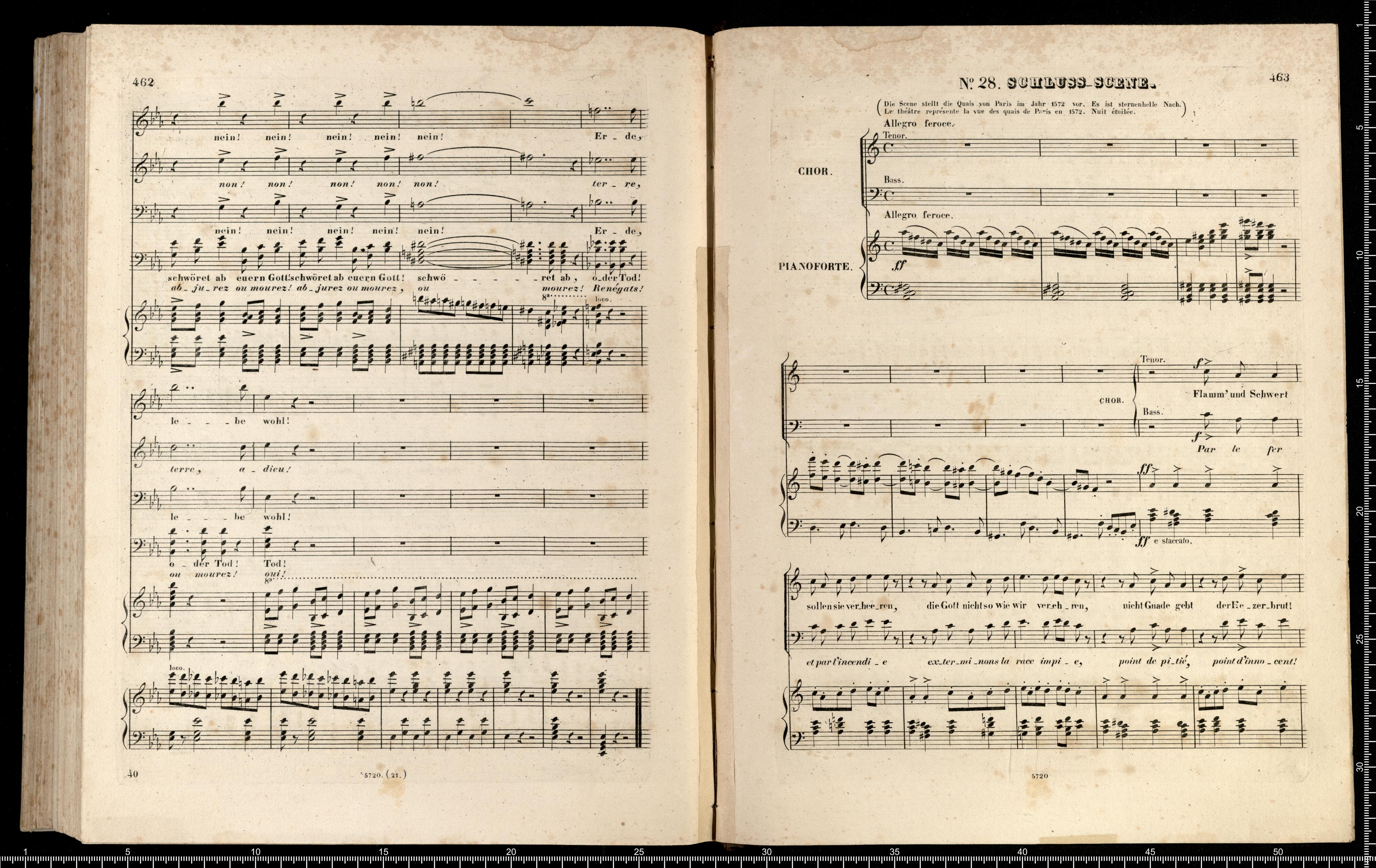 Die Hugenotten | (LES HUGUENOTS) | Grosse Oper in fünf Aufzügen | von E. Scribe | mit deutscher Übersetzung | von | J. F. CASTELLI | K. K. Landschafts Secretaire | componirt | von | Giacomo Meyerbeer | Kapellmeister am Königl. Preuss. Hofe | Ritter der Ehrenlegion etc. | Vollständiger Klavierauszug. | nach der Originalpartitur | von | CH. SCHWENCKE | MIT DEM PORTRAIT DES COMPONISTEN. | Eigenthum der Verleger. | Leipzig, bei Breitkopf & Härtel. | Paris, bei M. Schlesinger. London, bei Mori & Lavenn. | S|t Petersburg, bei Bernard & Holtz. Moskau, bei Paul Lehnhold. | Pr. 15 Thaler netto. | Eingetragen in das Vereins-Archiv. | Lith. bei Fr. Krätzschmer in Leipzig