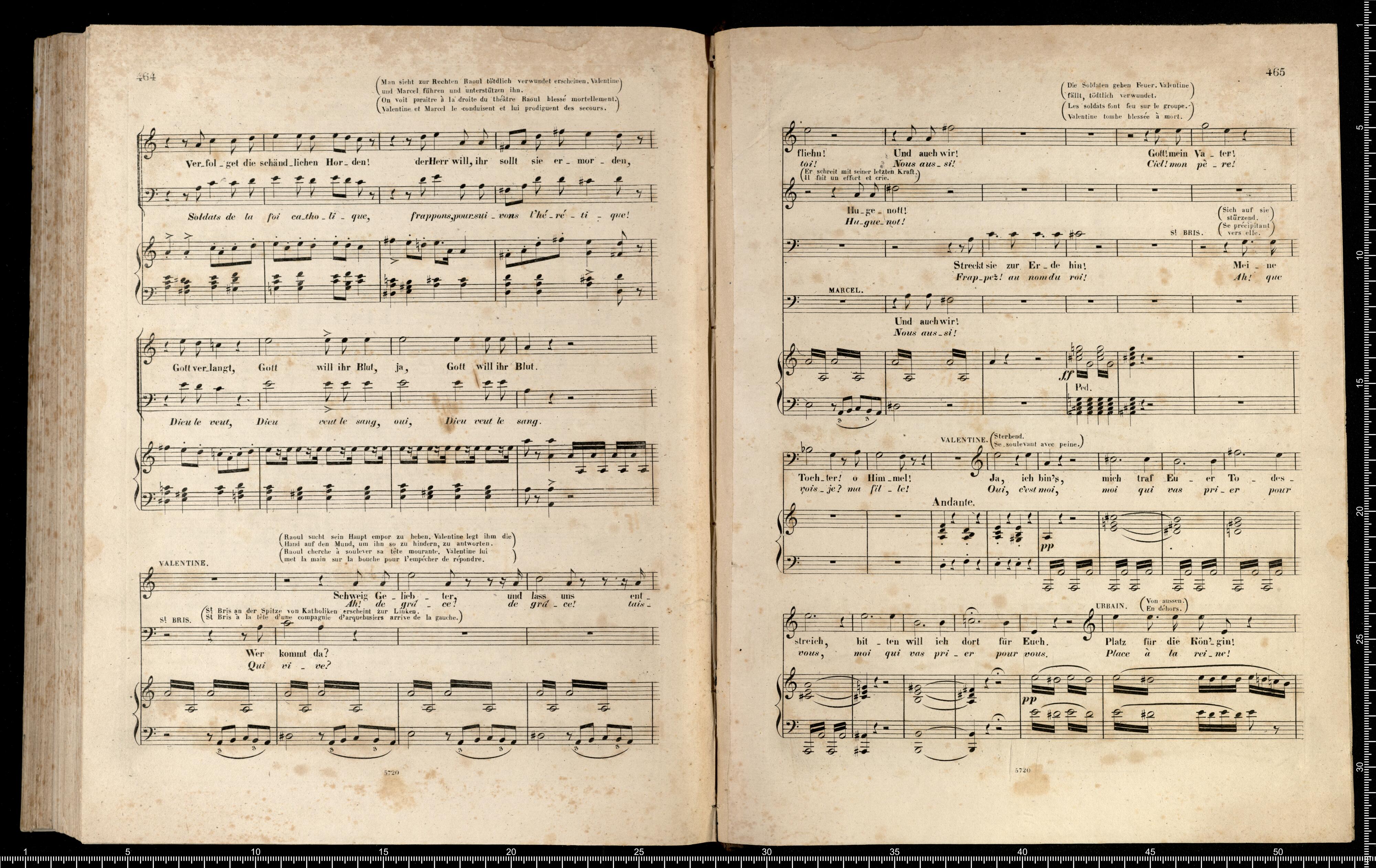 Die Hugenotten | (LES HUGUENOTS) | Grosse Oper in fünf Aufzügen | von E. Scribe | mit deutscher Übersetzung | von | J. F. CASTELLI | K. K. Landschafts Secretaire | componirt | von | Giacomo Meyerbeer | Kapellmeister am Königl. Preuss. Hofe | Ritter der Ehrenlegion etc. | Vollständiger Klavierauszug. | nach der Originalpartitur | von | CH. SCHWENCKE | MIT DEM PORTRAIT DES COMPONISTEN. | Eigenthum der Verleger. | Leipzig, bei Breitkopf & Härtel. | Paris, bei M. Schlesinger. London, bei Mori & Lavenn. | S|t Petersburg, bei Bernard & Holtz. Moskau, bei Paul Lehnhold. | Pr. 15 Thaler netto. | Eingetragen in das Vereins-Archiv. | Lith. bei Fr. Krätzschmer in Leipzig