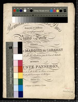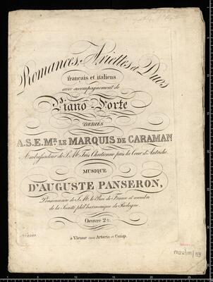 Romances, Ariettes et Duos | francais et italiens | avec accompagnement de | Piano-Forte | DEDIÉS | A.S.E.M|R. LE MARQUIS DE CARAMAN | Amlafsadeur de S.M. Trés Chretienne prés la lour d'Autriche. | MUSIQUE | D'AUGUSTE PANSERON, | Pensionnaire de S.M. le Roi de France et membre | de la Société phil'harmonique de Bologne. | Oeuvre 2|de. | N|o 2548. à Vienne chez Artaria et Comp, 6 Vocal pieces. 2