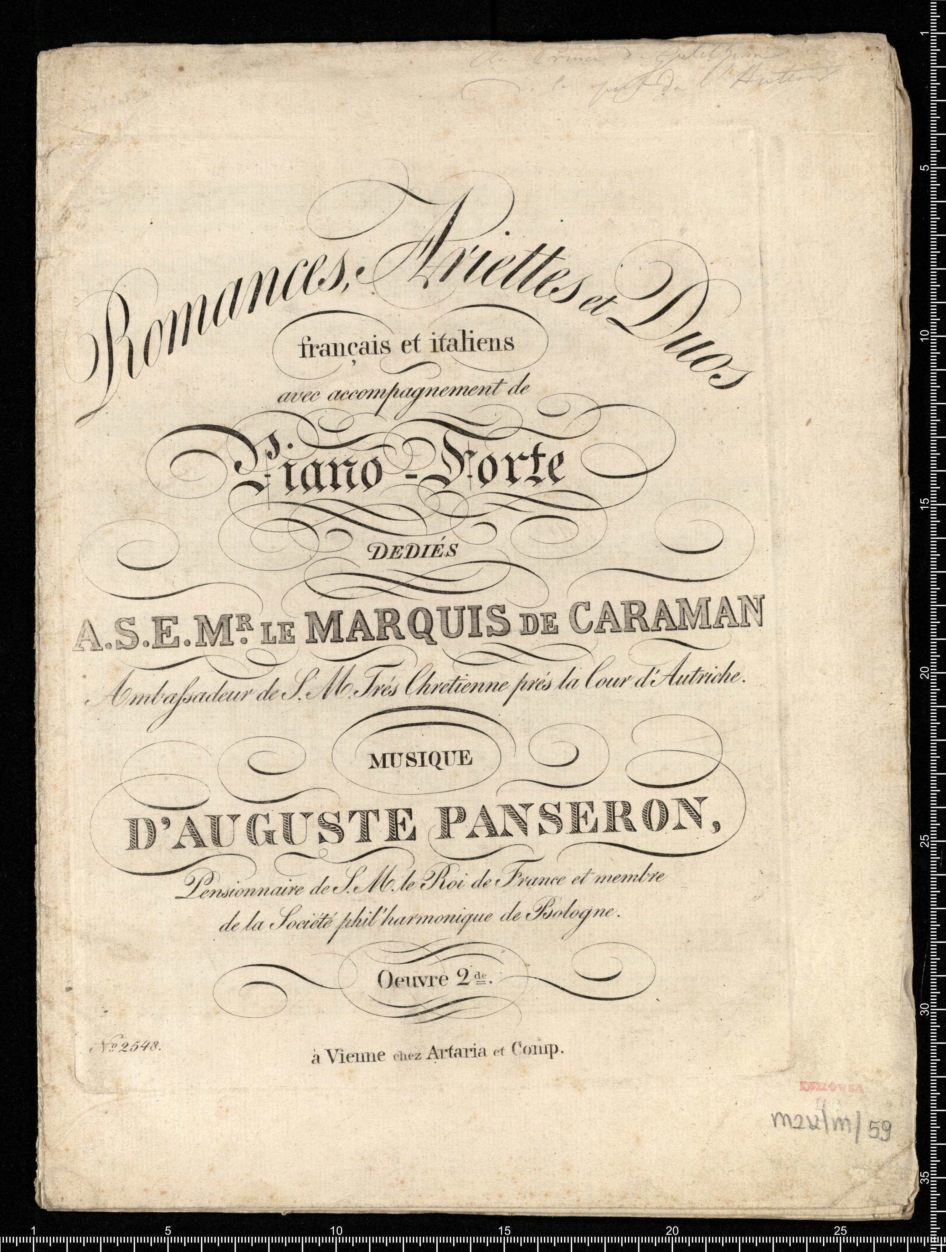 Romances, Ariettes et Duos | francais et italiens | avec accompagnement de | Piano-Forte | DEDIÉS | A.S.E.M|R. LE MARQUIS DE CARAMAN | Amlafsadeur de S.M. Trés Chretienne prés la lour d'Autriche. | MUSIQUE | D'AUGUSTE PANSERON, | Pensionnaire de S.M. le Roi de France et membre | de la Société phil'harmonique de Bologne. | Oeuvre 2|de. | N|o 2548. à Vienne chez Artaria et Comp