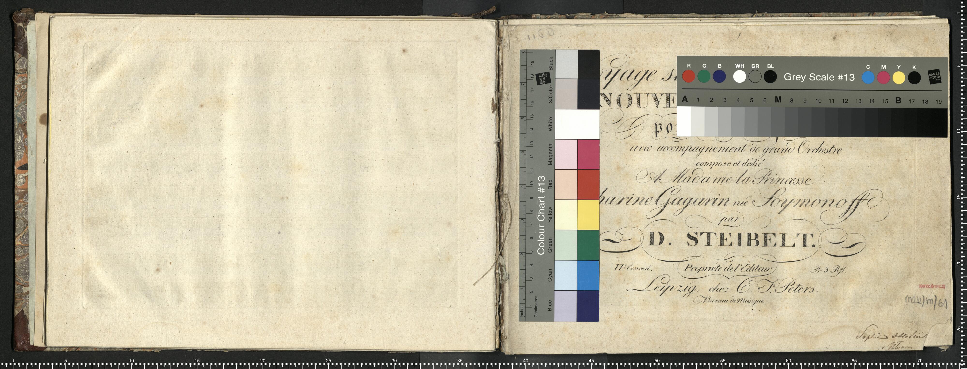Voyage sur le mont Bernard | NOUVEAU CONCERTO | pour le Pianoforte | avec accompagnement de grand Orchestre | composé et dédié | A. Madame la Princesse | Catharine Gagarin née Soymonoff | par | D. STEIBELT. | VI Concert. Propriété de l'Editeur Pr. 3 RB. | Leipzig, chez C. F. Peters. | Bureau de Musique