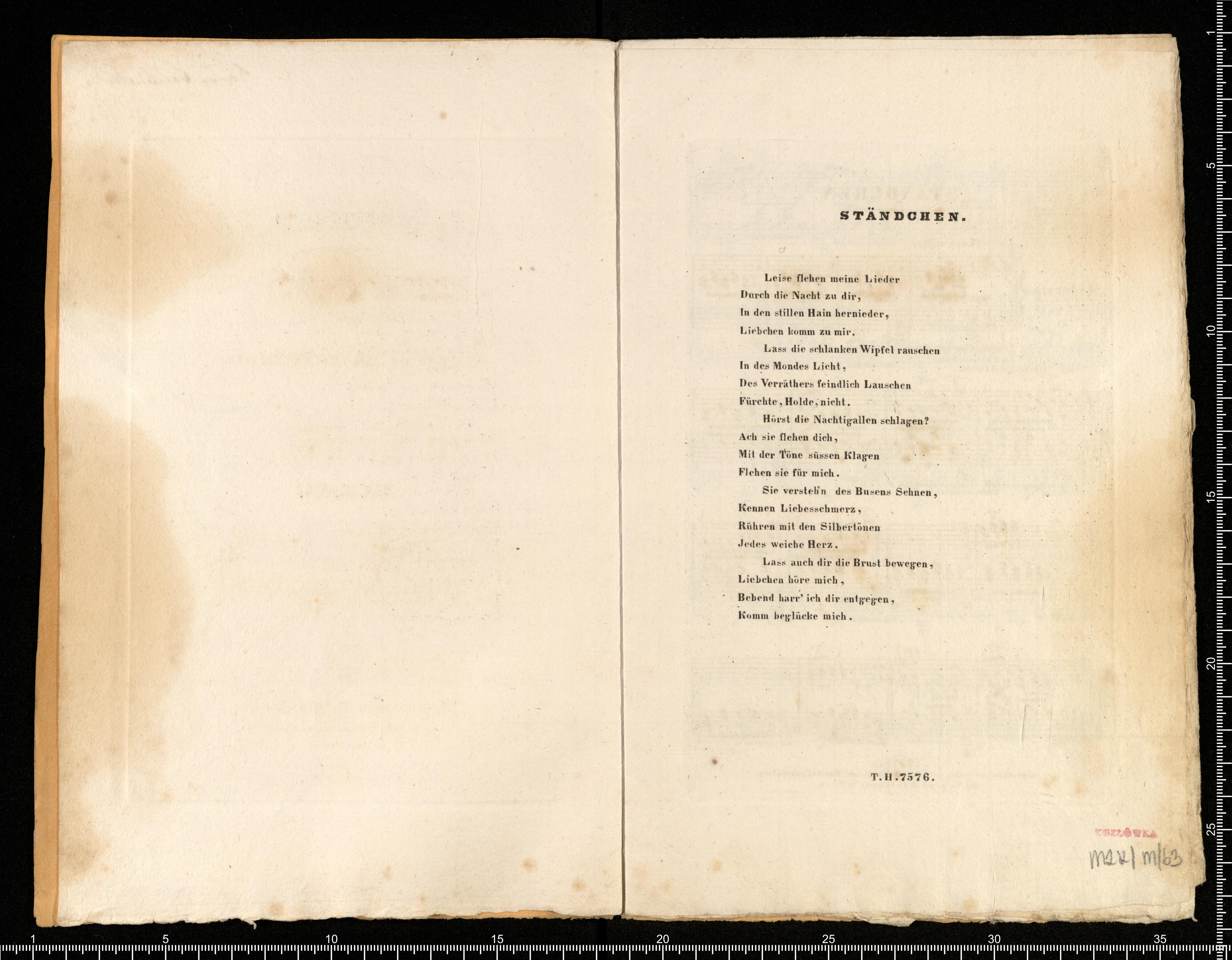 [cover tittle:] STÄNDCHEN | Sérénade | LIED DE FR. SCHUBERT. | Transcrit pour | PIANO | par | FRANC. LISZT. | Propriété des Editeurs | No. 7576 Prix 45x C.M./ 12 Gr. | Vienne chez Tob. Haslinger | Marchand de Musique etc. de la Cour J.etR | Graben No. 618. | Paris, chez S. Richault. | Milan, chez Ricordi _ Londres, chez Mori