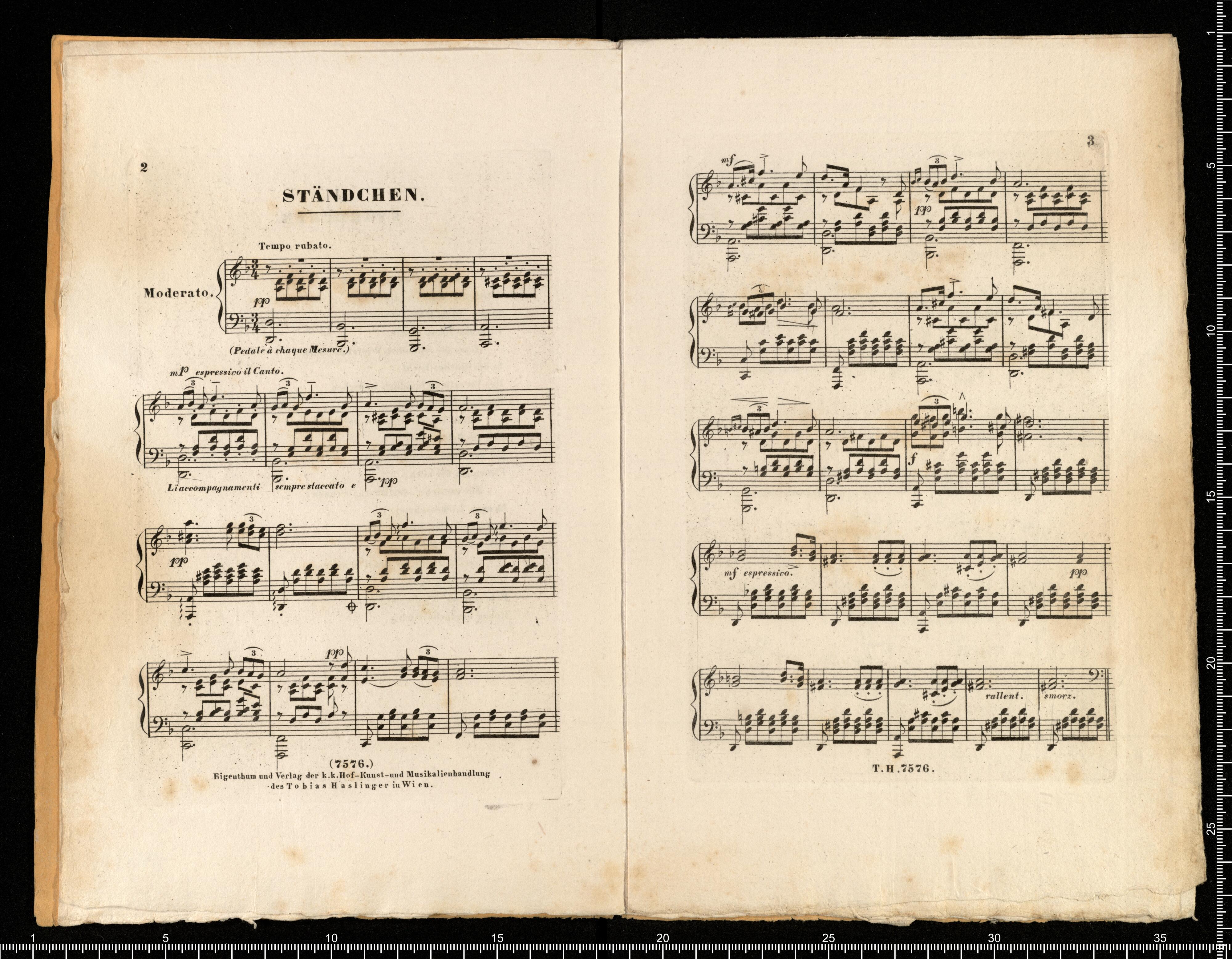 [cover tittle:] STÄNDCHEN | Sérénade | LIED DE FR. SCHUBERT. | Transcrit pour | PIANO | par | FRANC. LISZT. | Propriété des Editeurs | No. 7576 Prix 45x C.M./ 12 Gr. | Vienne chez Tob. Haslinger | Marchand de Musique etc. de la Cour J.etR | Graben No. 618. | Paris, chez S. Richault. | Milan, chez Ricordi _ Londres, chez Mori