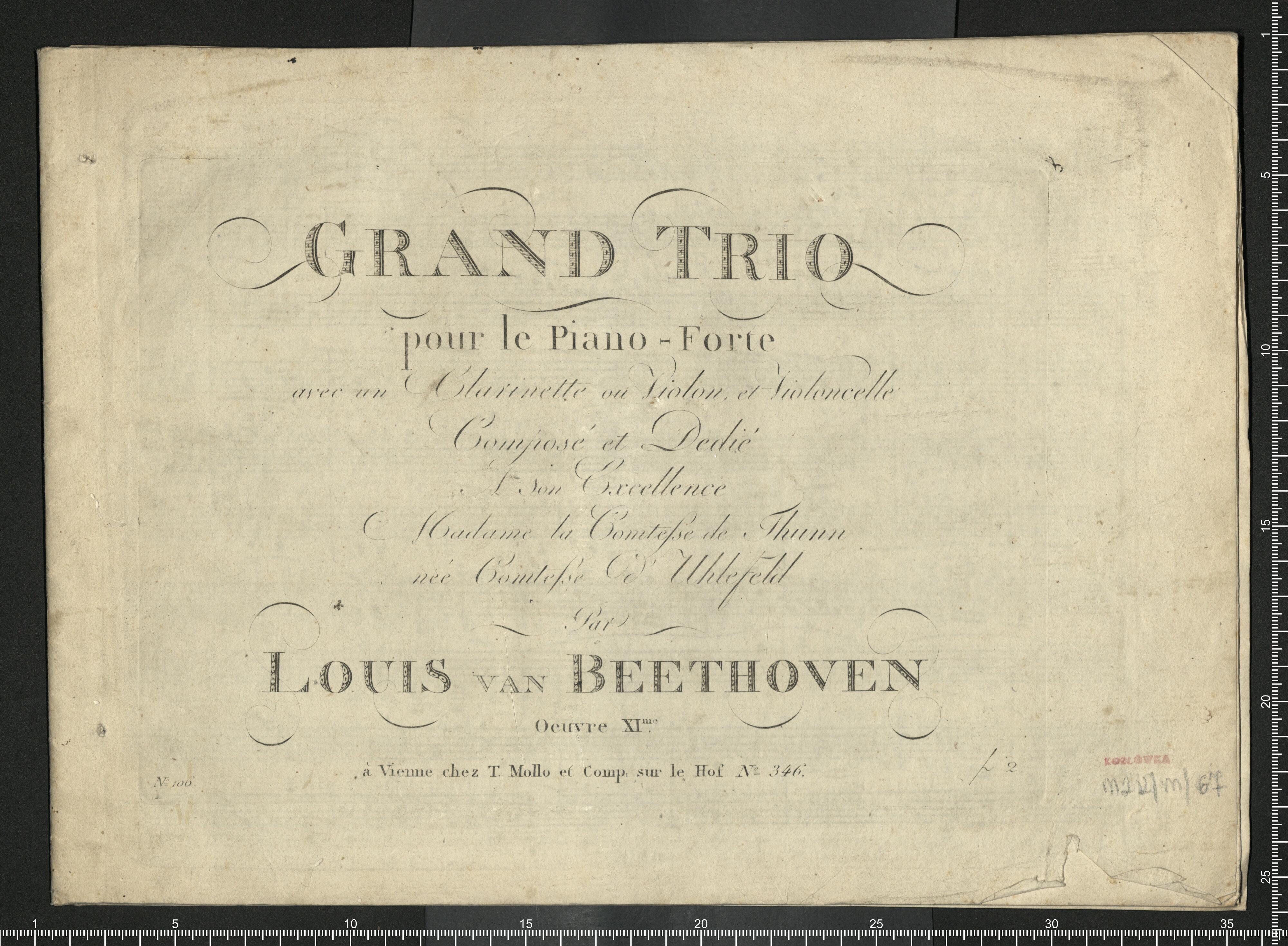[title page:] Grand Trio | pour le Piano - Forte | avec un Clarinette ou Violon, et Violoncelle | Composé et Dedié | A Son Excellence | Madame la Comtesse de Thunn [!] | neé Comtesse d' Uhlefeld | Par | Louis van Beethoven | Oeuvre XI|m.|e | à Vienne chez T. Mollo et Comp. sur le Hof N=|o 346. [space] L 2 | No 106