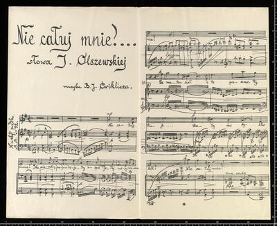 Trzy pieśni | miłosne: | 1. Mów do mnie jeszcze... słowa K. Tetmajera. | (Poezye W.1898 II, str.201.) | 2. Nie całuj mnie... słowa J. Olszewskiej. | (z rękopisu) | 3. To sen był tylko... słowa J. Olszewskiej. | (z rękopisu) | na 1 głos z towarzyszeniem | fortepianu | napisał | Bolesław Jan Ćwiklicz. | Lwów. | Nakład własność autora muzyki. | Cena każdej po 40 Kal. | Na sopran lub tenor. Na mecosopran lub baryton. | Na kontralt lub bas, Nie całuj mnie... | słowa J. Olszewskiej | muzyka B. J. Ćwiklicza, Nie całuj mnie... V, pf G