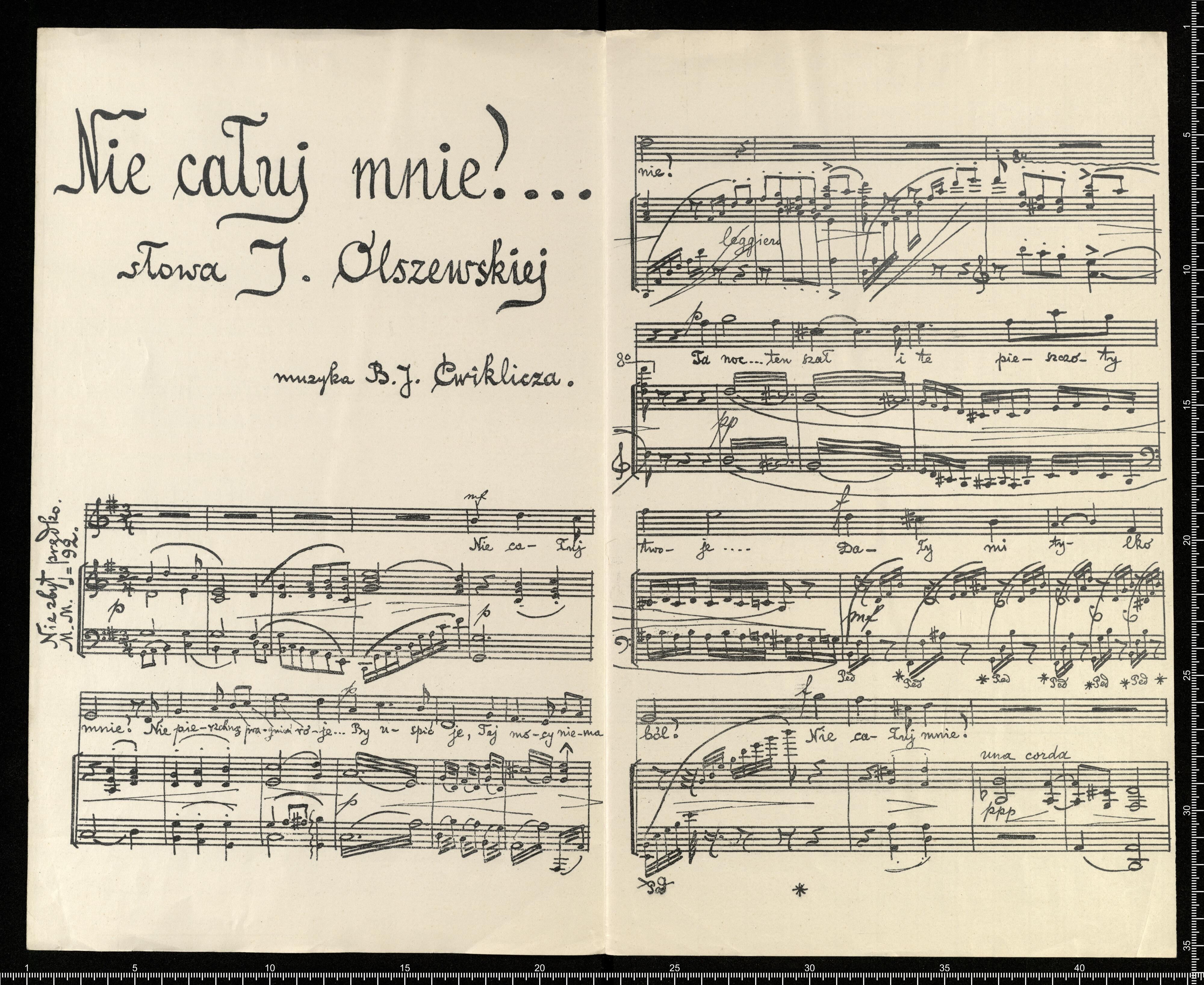 Trzy pieśni | miłosne: | 1. Mów do mnie jeszcze... słowa K. Tetmajera. | (Poezye W.1898 II, str.201.) | 2. Nie całuj mnie... słowa J. Olszewskiej. | (z rękopisu) | 3. To sen był tylko... słowa J. Olszewskiej. | (z rękopisu) | na 1 głos z towarzyszeniem | fortepianu | napisał | Bolesław Jan Ćwiklicz. | Lwów. | Nakład własność autora muzyki. | Cena każdej po 40 Kal. | Na sopran lub tenor. Na mecosopran lub baryton. | Na kontralt lub bas