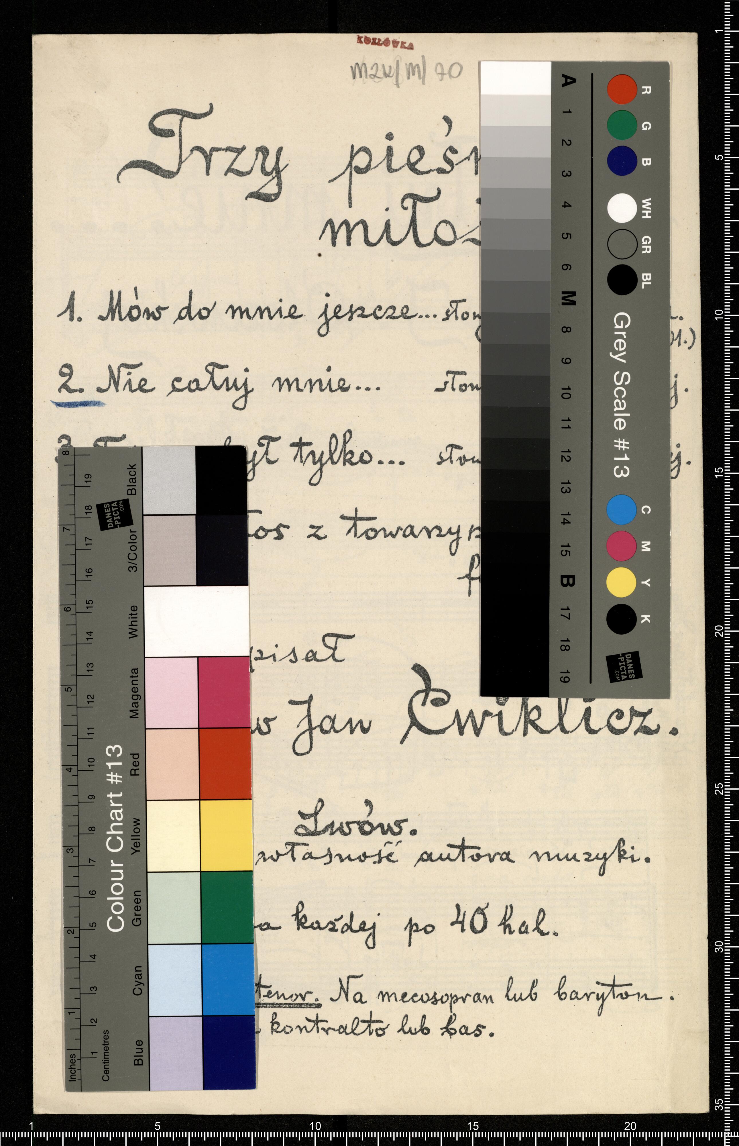 Trzy pieśni | miłosne: | 1. Mów do mnie jeszcze... słowa K. Tetmajera. | (Poezye W.1898 II, str.201.) | 2. Nie całuj mnie... słowa J. Olszewskiej. | (z rękopisu) | 3. To sen był tylko... słowa J. Olszewskiej. | (z rękopisu) | na 1 głos z towarzyszeniem | fortepianu | napisał | Bolesław Jan Ćwiklicz. | Lwów. | Nakład własność autora muzyki. | Cena każdej po 40 Kal. | Na sopran lub tenor. Na mecosopran lub baryton. | Na kontralt lub bas
