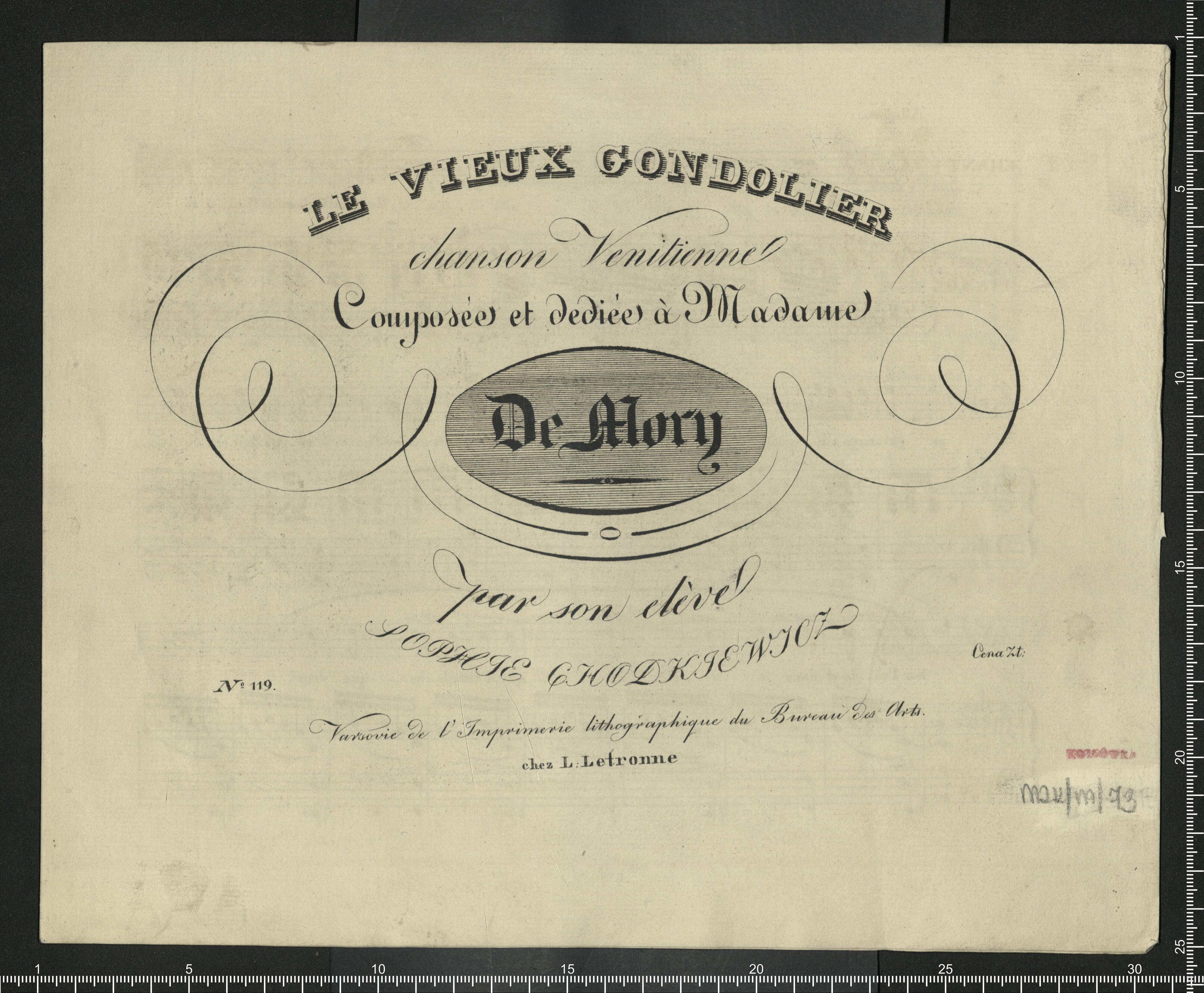 LE VIEUX GONDOLIER | chanson Venitienne | Composée et dediée à Madame | De Mory | par son élève | SOPHIE CHODKIEWICZ | N-o 119 | Varsovie de l’Imprimerie litographique du Bureau des Arts. | chez L. Letronne