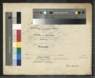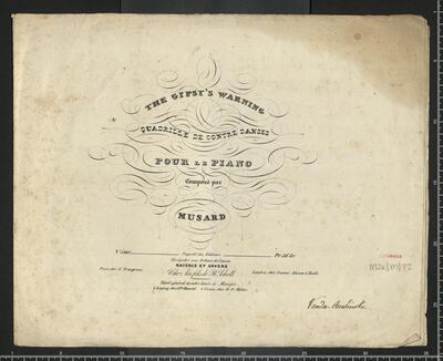[title page:] THE GIPSY'S WARNING | QUADRILLE DE CONTRE DANSES | POUR LE PIANO | Composé par | MUSARD | N|o 5241. Propriété des Editeurs. Pr. 36 kr. | Enrégistré aux Archives de l'union. | MAYENCE ET ANVERS | Paris, chez E. Troupenas. Chez les fils de B. Schott Londres, chez Cramer, Adisson & Beale. | Dépòt général de notre fonds de Musique. | à Leipzig, chez G|m|e Haertel. à Vienne, chez H. F. Müller. | [in black ink:] Vanda Ossolińska, Quadrilles pf, The Gypsy's warning Excerpts Arr