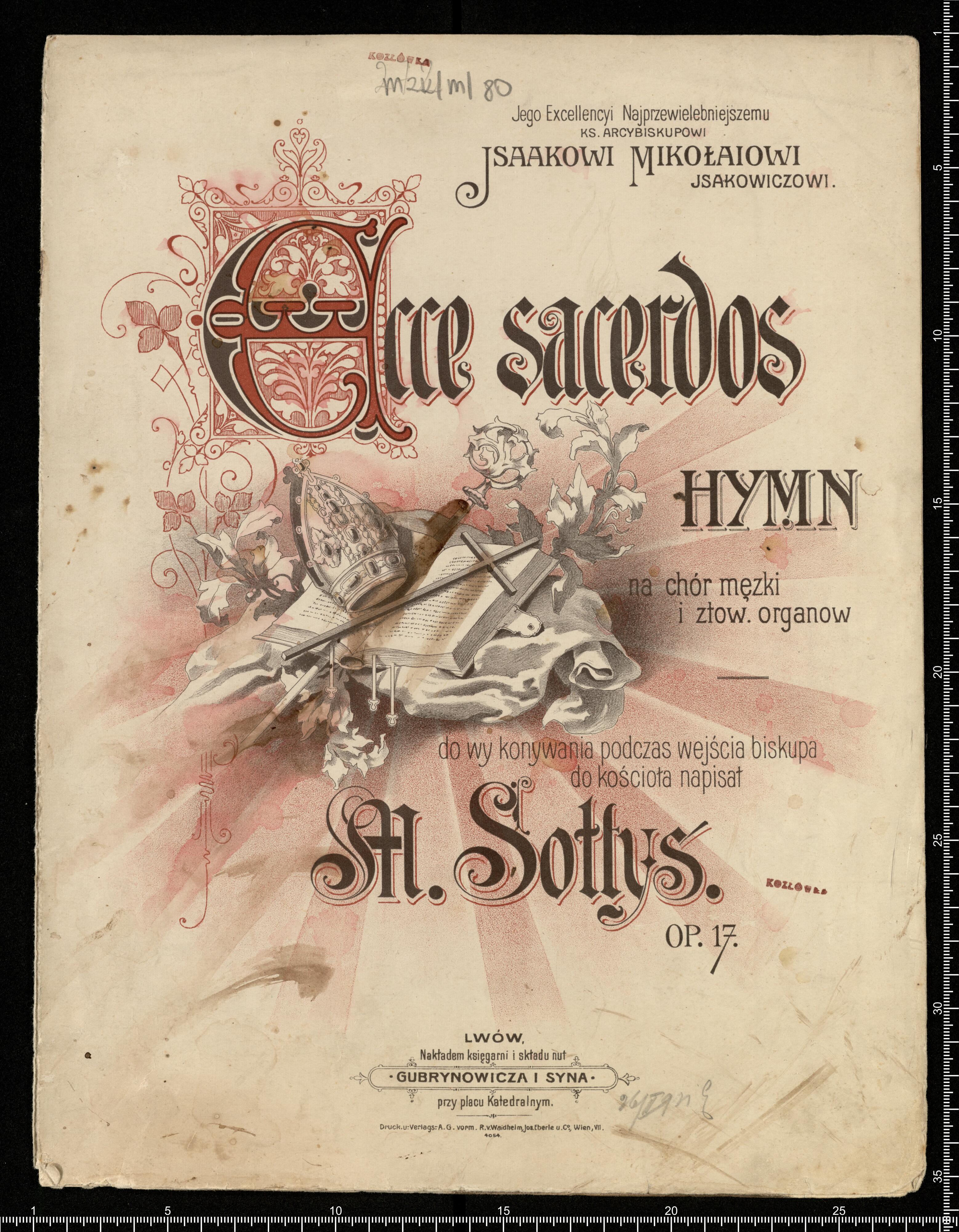Jego Excellencyi Najprzewielebniejszemu | KS. ARCYBISKUPOWI | ISSAKOWI MIKOŁAIOWI | ISAKOWICZOWI. | Ecce sacerdos | HYMN | na chór męski | i ztow. organow | do wykonywania podczas wejścia biskupa | do kościoła napisał | M. Sołtys. | OP. 17. | LWÓW | Nakładem księgarni i składu nit | GUBRYNOWICZA I SYNA. | przy placu Katedralnym. | Druck. u: Verlags: A. G. vorm. R. v. Waidheim, Jos. Eberle u. C, Wien, VIII. | 4054