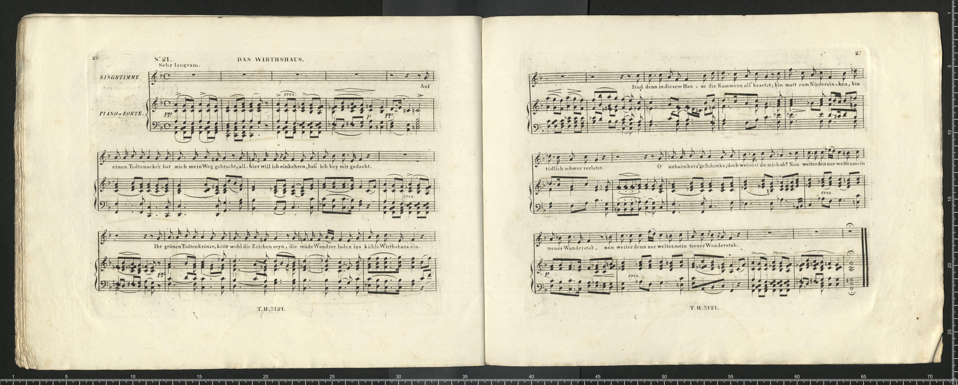 WINTERREISE. | von | WILHELM MÜLLER. | In Musik gesetzt | für eine Singstimme mit Begleitung des Pianoforte | von | Franz Schubert. | 99stes [?] Werk. | 1te Abtheilung. | No. 5101.5113. | EIGENTHUM DES VERLEGERS Preis für die | Wien, by [?] Tobias Haslinger. | Musikverleger | im Hause der ersten österr: Sparkasse | am Graben No. 572